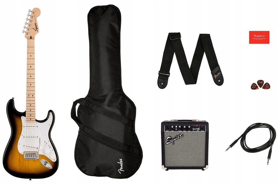Squier Sonic Strat Pack — идеальный выбор для новичков, в нем есть все необходимое, чтобы начать играть прямо из коробки. - Электрогитара Squier Sonic Stratocaster с легким корпусом, ввинчивающимся грифом "Bolt-On",тремоло-бриджем в винтажном стиле, тремя звукоснимателями Single Coil.