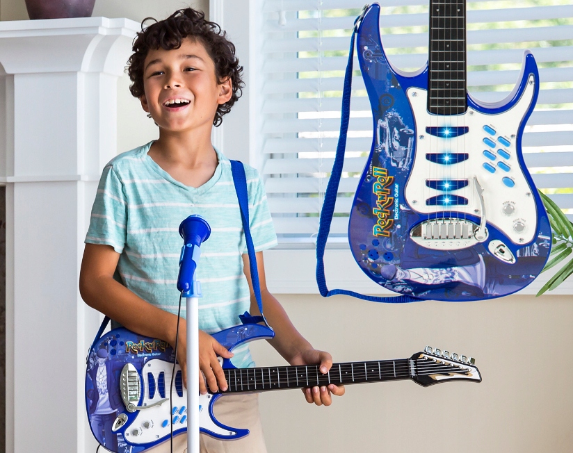 • Микрофон можно оставить включенным или выключенным (функция включения/выключения микрофона). Если ваш ребенок решит петь, его не заглушат мелодии, исполняемые на гитаре - микрофон усиливает голос певца так, что он оказывается на переднем плане.