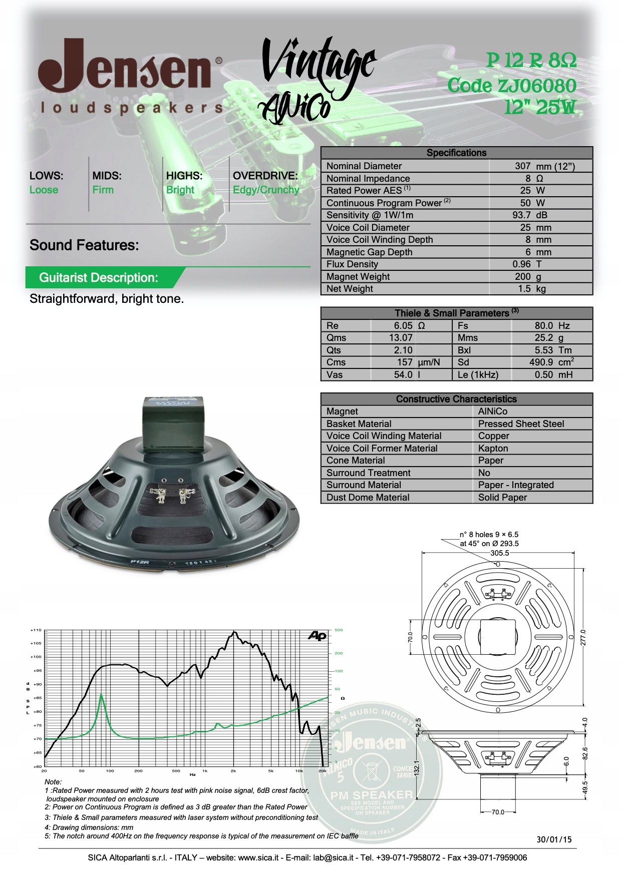 Предлагаемый тип громкоговорителя относится к серии ALNICO. Гитаристам, владеющим P12R Alnico, нравится его простой, яркий, очень насыщенный винтажный звук. Счастливые обладатели Jensen P12R считают, что он идеально подходит для блюза, джаза и софт-рока.