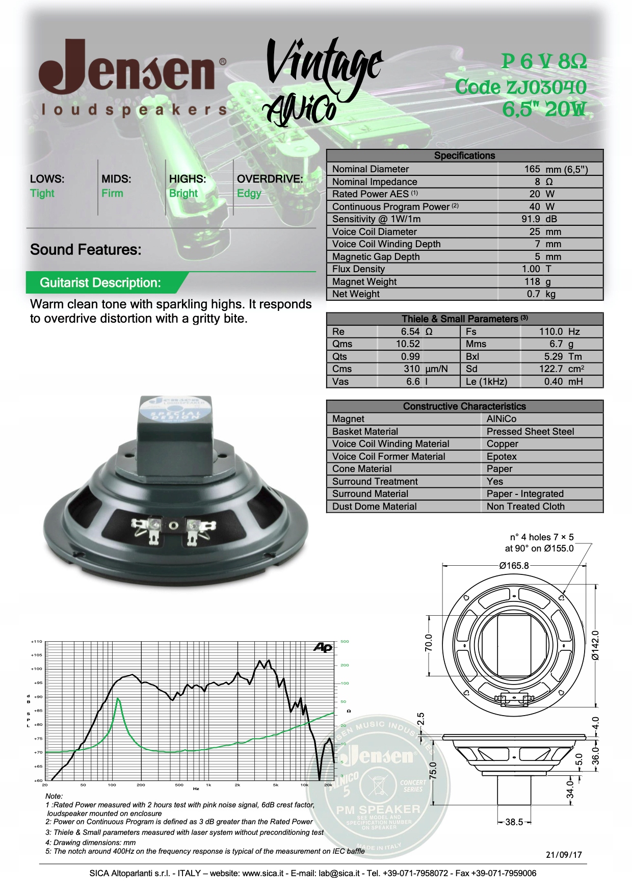 Гитарный динамик Jensen p6v — шестидюймовая версия на основе магния Alnico. Изделие имеет мощность 20 Вт AES, импедансы сопротивлением 4 или 8 Ом и эффективностью 91,8 дБ. Громкоговоритель имеет быстрое время отклика на звук и поэтому образует единство с правильно подобранным усилителем. Изделие может использоваться как профессиональными, так и менее профессиональными пользователями. Alnico Jensen p6v 6" Серия известна и ценится во всем мире, а низкая мощность не всегда связана с худшим качеством звука.
