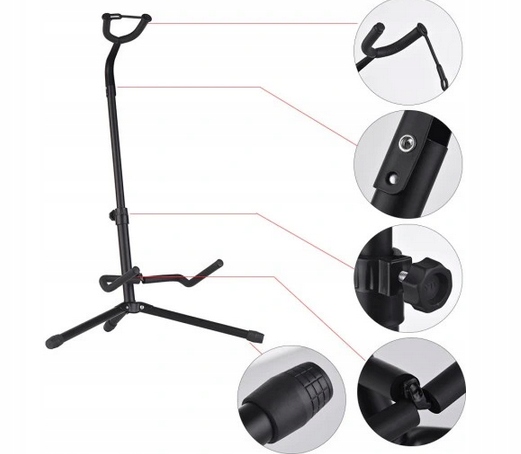 Стойка имеет стрелу и фиксатор шеи. Благодаря этому он отлично защитит ваш инструмент от соскальзывания с подставки. Регулируемая высота позволит вам адаптироваться как к маленьким, так и к большим размерам гитары. Ножки штатива имеют резиновые нескользящие накладки, что делает его более устойчивым. Плечи рукоятки покрыты защитной пеной, которая обеспечит уход за инструментом и от царапин!