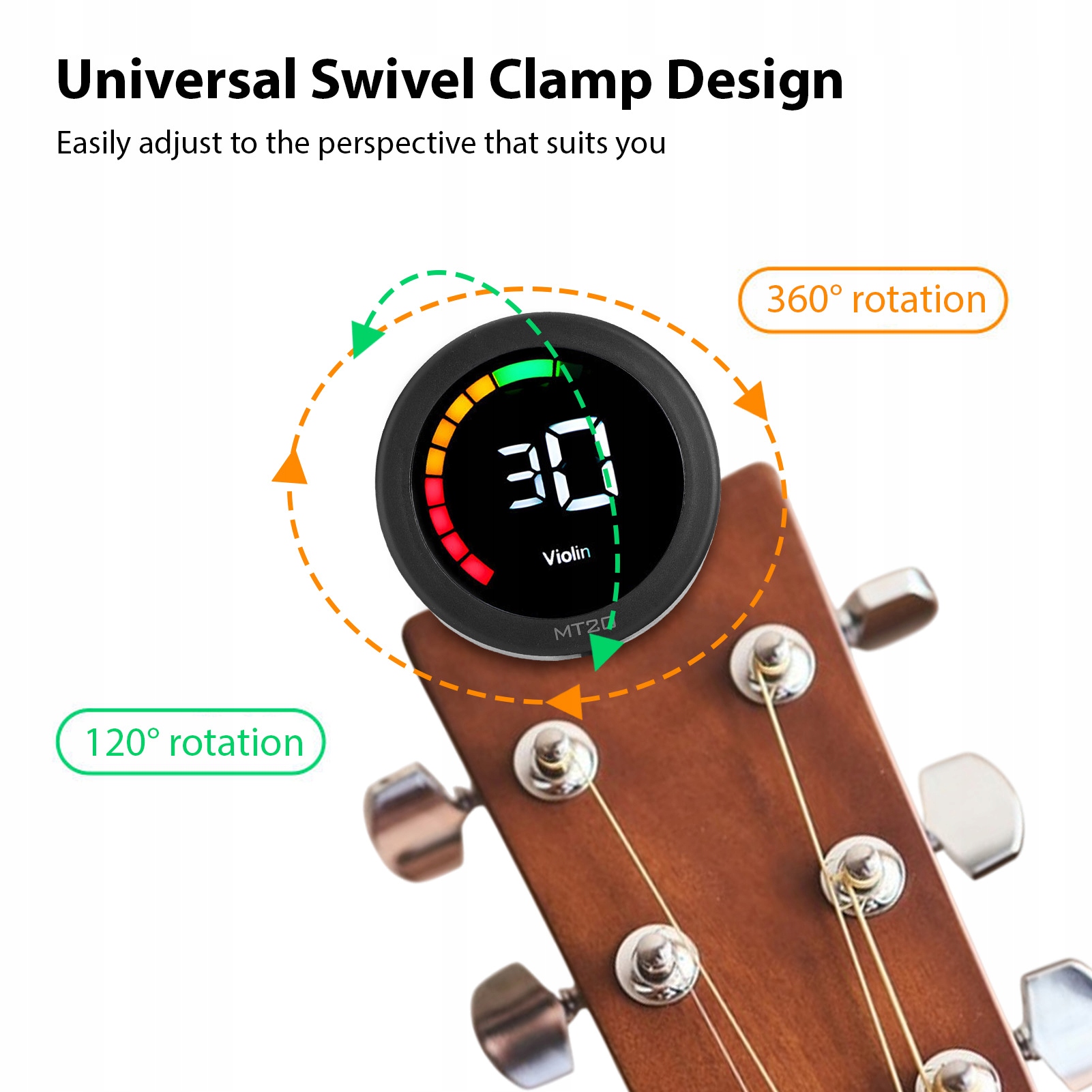 2. Вращающийся на 360 градусов зажим: эти универсальные зажимы для тюнера могут вращаться на 360 градусов, что позволяет удобно использовать его под разными углами. Он минималистичный и практичный, поэтому подходит для любого аксессуара для бас-гитары или струнного инструмента.