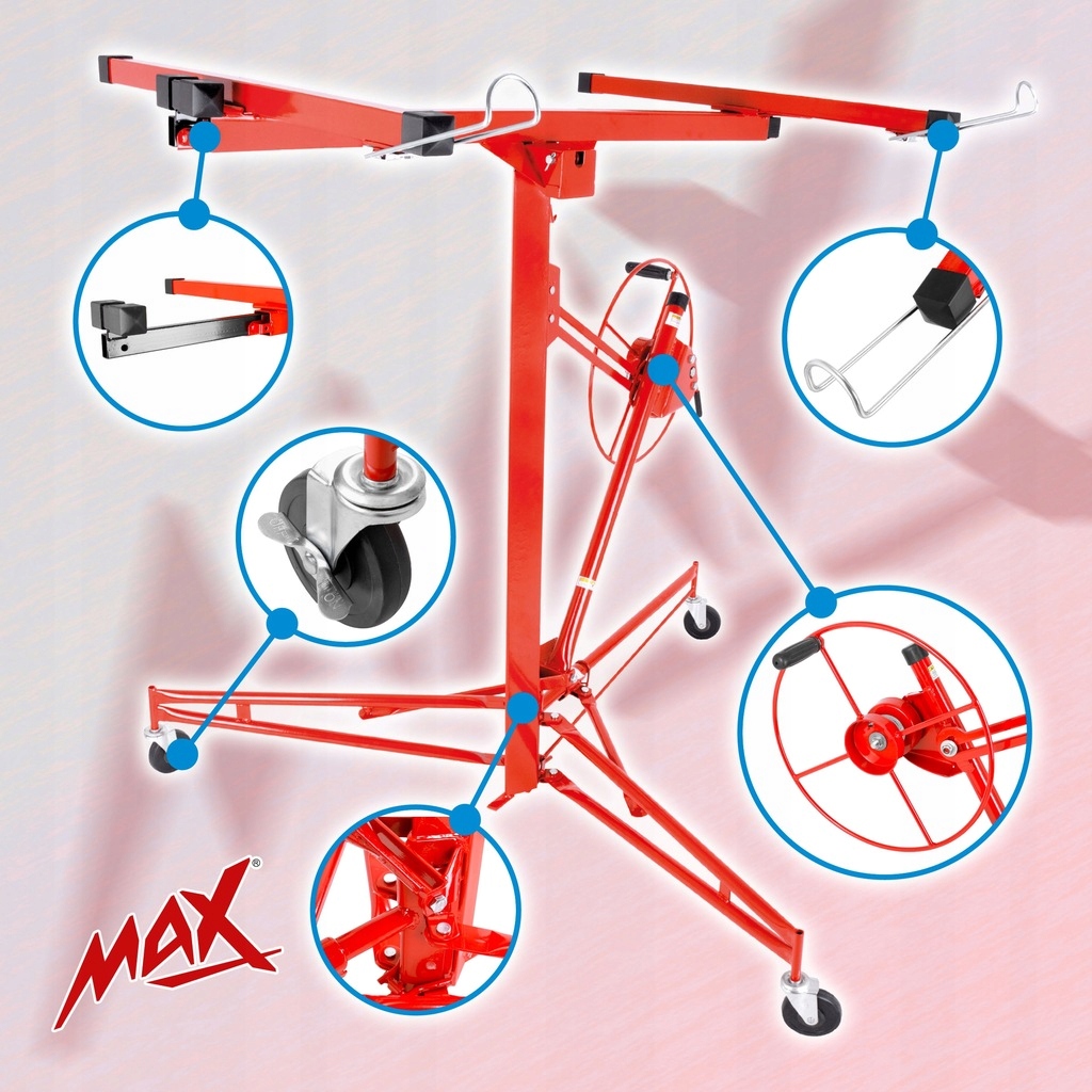 ➩ из стали, покрытой красным покрытием, лифт твердый и долговечный. Специально разработанная система блоков и катушек позволяет плавно поднимать и опустить пластину вместе с бумом без необходимости применения большого количества силы. Бум после подъема блокируется в желаемом положении, обеспечивая стабильность и безопасность во время работы. Удобный рычаг используется, чтобы оставить его снова