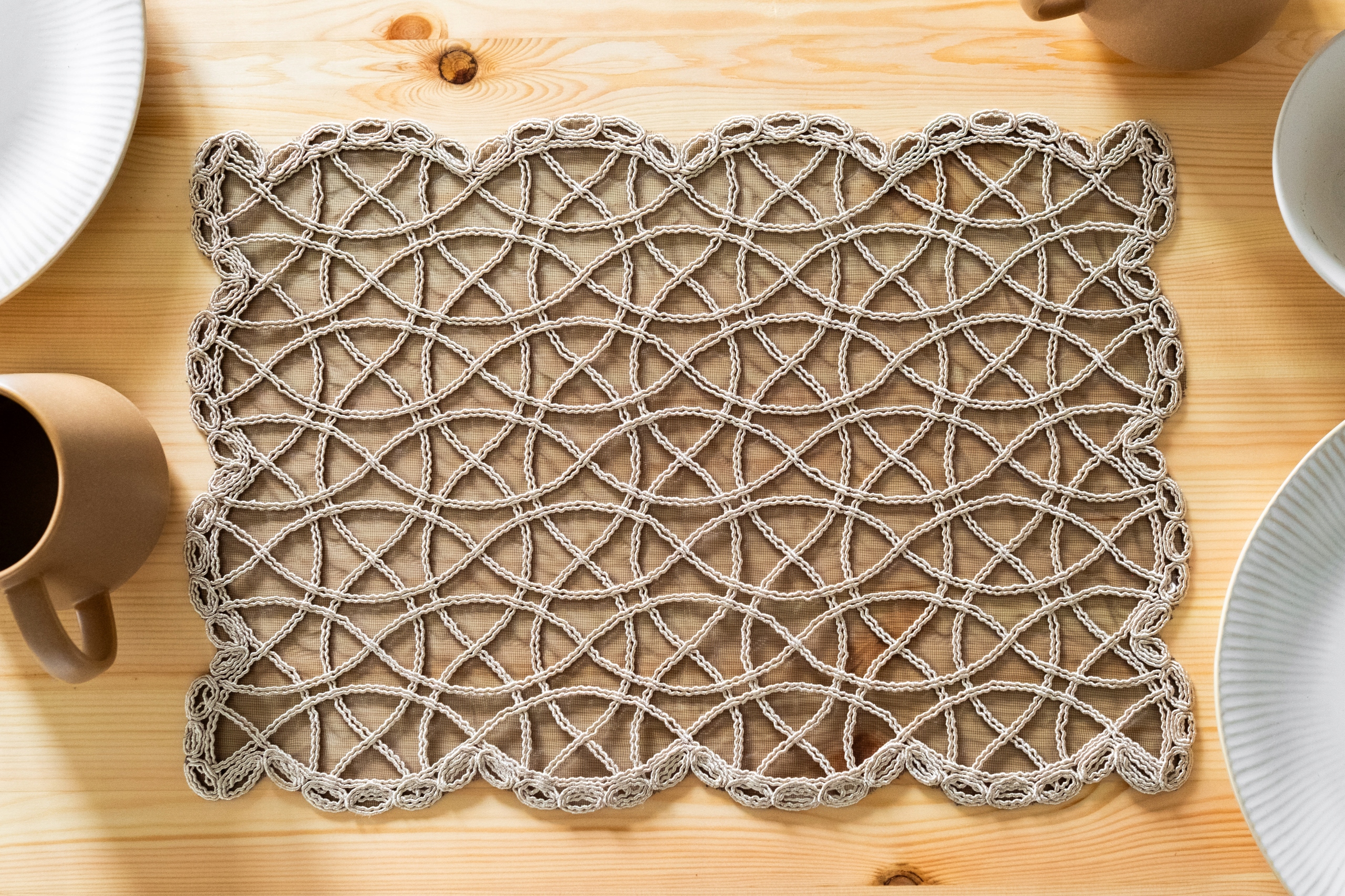 ✔️ pattern: sophisticated, geometric motif made of delicate braided yarn with a mesh