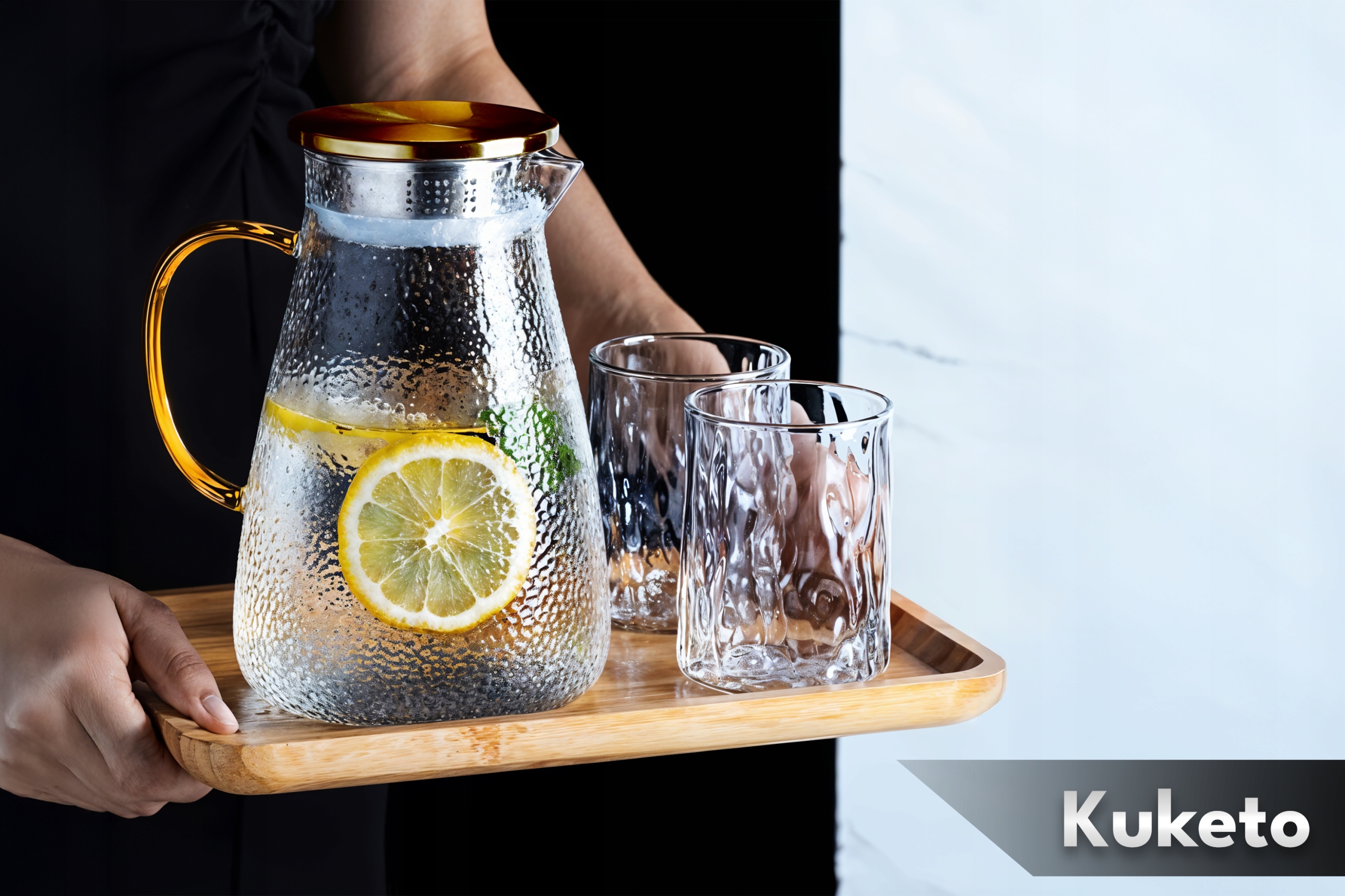 ☑ кувшин не только практичен, но и чрезвычайно элегантный. Золотая ручка в золотом цвете и металлическая крышка придают ему стильный вид, что делает ее идеальным для современных и классических интерьеров.