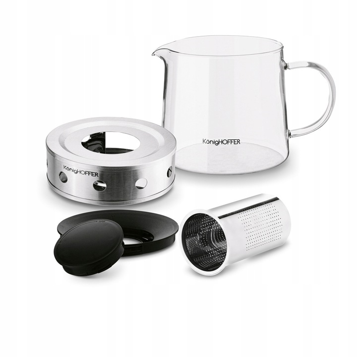 Заварочный чайник Konighoffer Andrea объемом 1,5 л с заварочным устройством изготовлен из боросиликатного стекла. Он легкий, имеет кристаллическую структуру и прекрасно подчеркивает цвет напитков. Он также обладает высокой устойчивостью к тепловому удару, царапинам и потускнению. В таком кувшине можно приготовить горячий чай и домашний лимонад с кубиками льда. В комплект также входит заварочная вставка из нержавеющей стали. Благодаря ему можно эффективно заваривать листовой чай и отделять от напитка замоченную траву. Крышка кувшина изготовлена из черного бакелита. Защищает содержимое от загрязнения. Он также защищает от проливания во время транспортировки. Изделие также имеет носик для точного наливания. Стеклянный кувшин можно мыть в посудомоечной машине. Вы также можете элегантно расширить десертный набор, которым пользуетесь каждый день дома. Подогреватель кувшина изготовлен из нержавеющей стали. С его помощью вы надолго сохраните чай в чайнике теплым. Вы также получите устойчивую, прочную модель, которая хорошо подойдет для вашего кофейного сервиза. Более того, вы позаботитесь о том, чтобы помещенная внутрь свеча не упала. Он также будет иметь достаточный запас воздуха для поддержания пламени. Для кувшина Андреа вы обязательно получите идеальную стальную подставку с нагревателем. Стоит выбрать эту модель, чтобы вся социальная встреча всегда прошла успешно и ваш запас свежезаваренного чая был в безопасности.