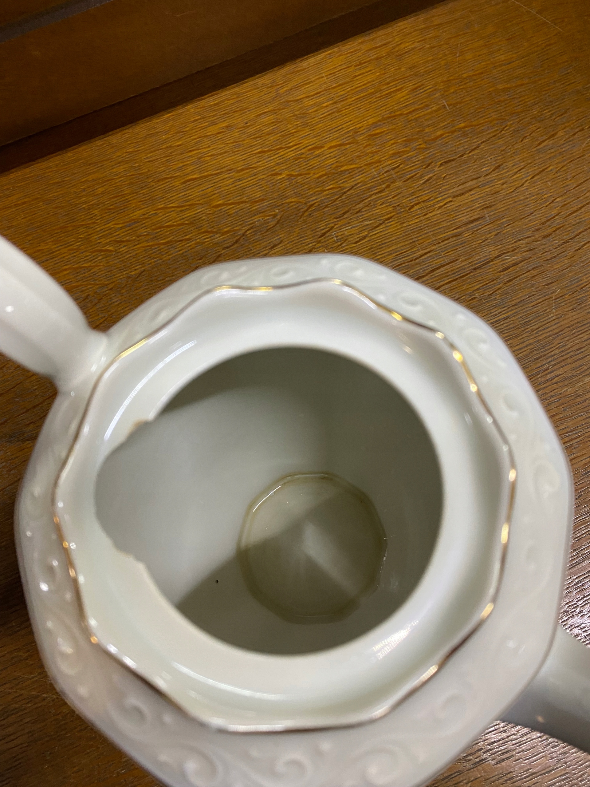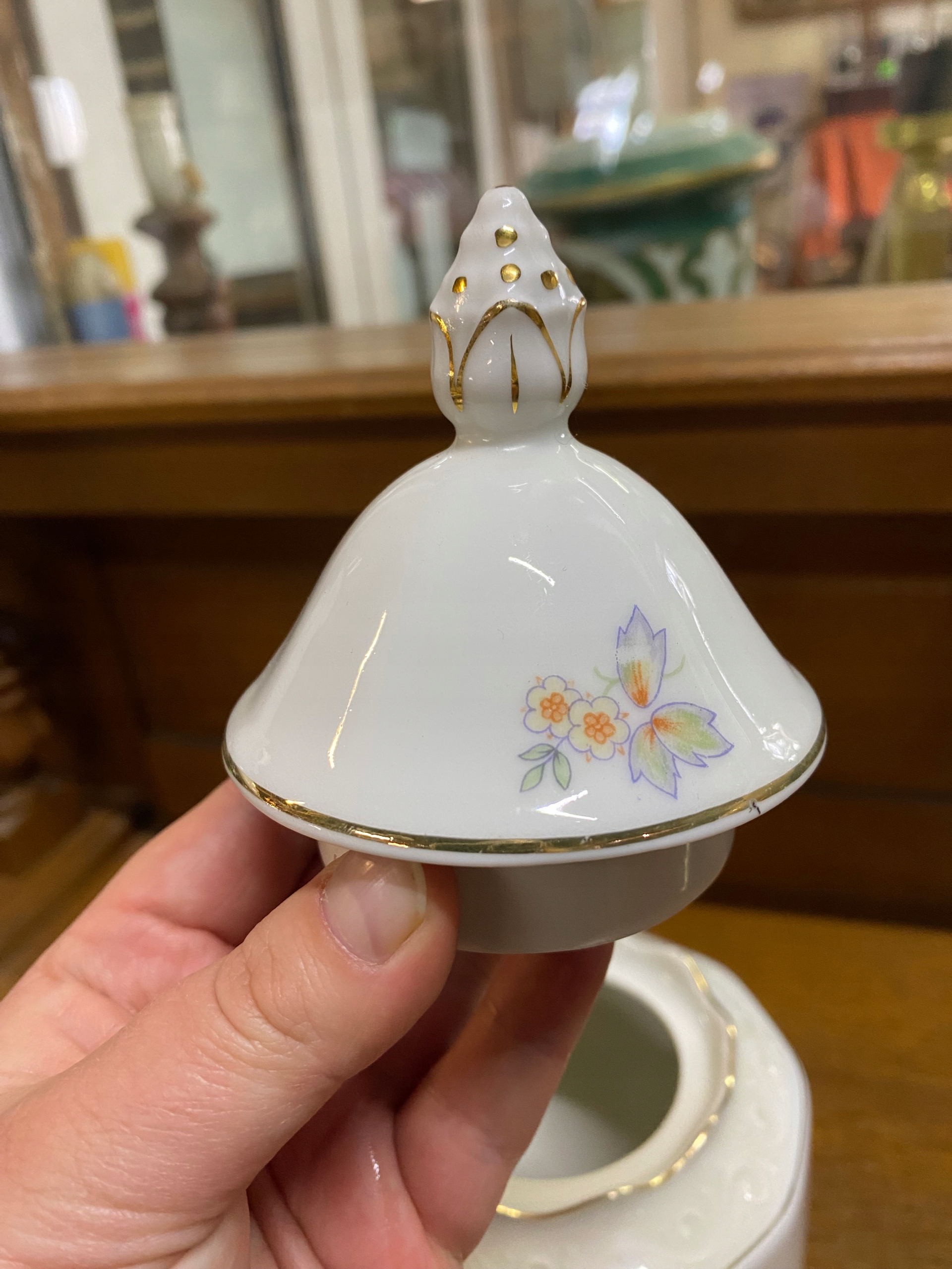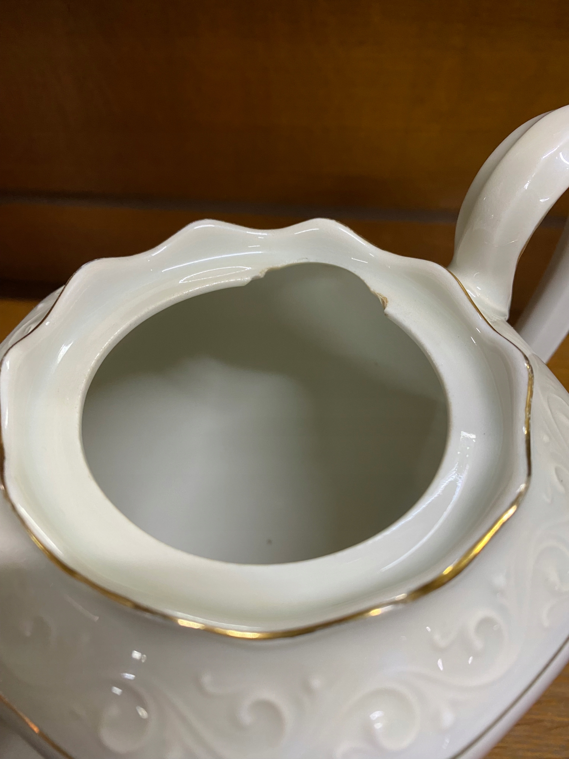 Состояние: поврежден. Все, что видно на фотографиях, кроме этого повреждения, имеет потертости позолоты по краям и, возможно, кое-где царапины, явно бывшие в употреблении :)