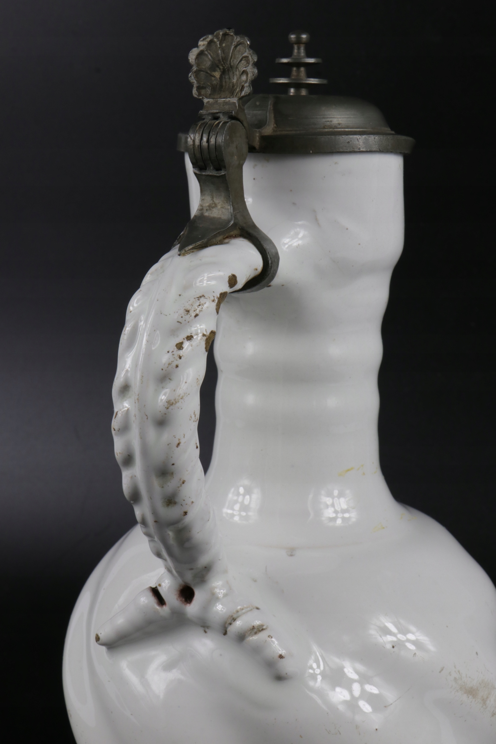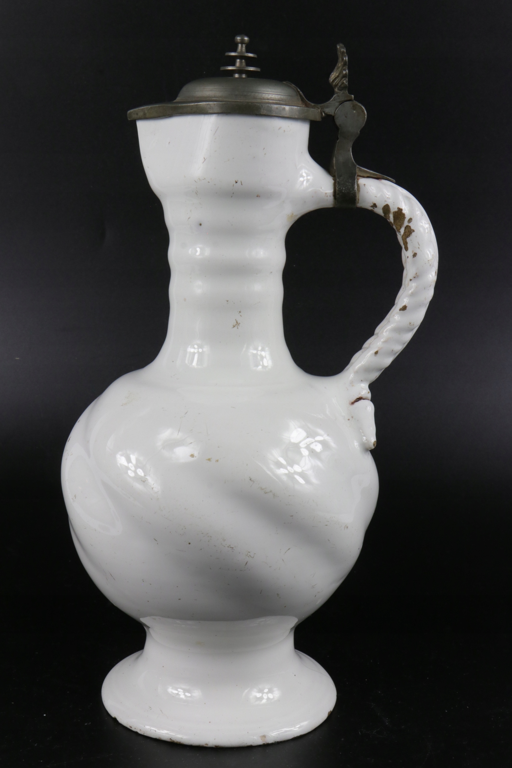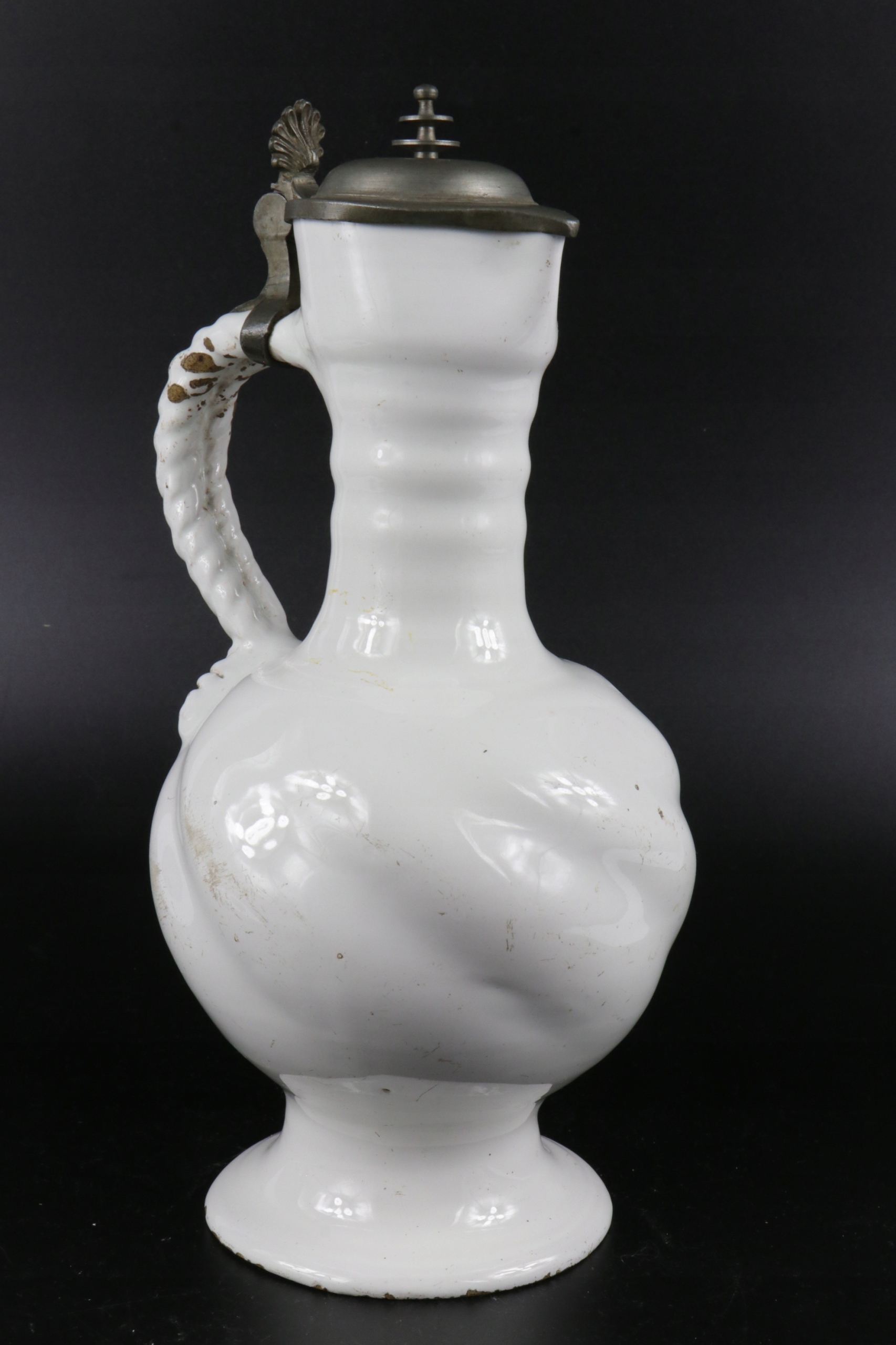 жених очень старый крем xvii или кувшин 18 -го века. Керамика завершена с цинковым возрастом и цинковым корпусом кувшины. Белая и белая кремовая керамика, скрученная живот, ручка, смоделированная в тип оплетки. Очень редкая коллекционная керамика. Возможно, из семинара из города Делфт "de Metal Pot"