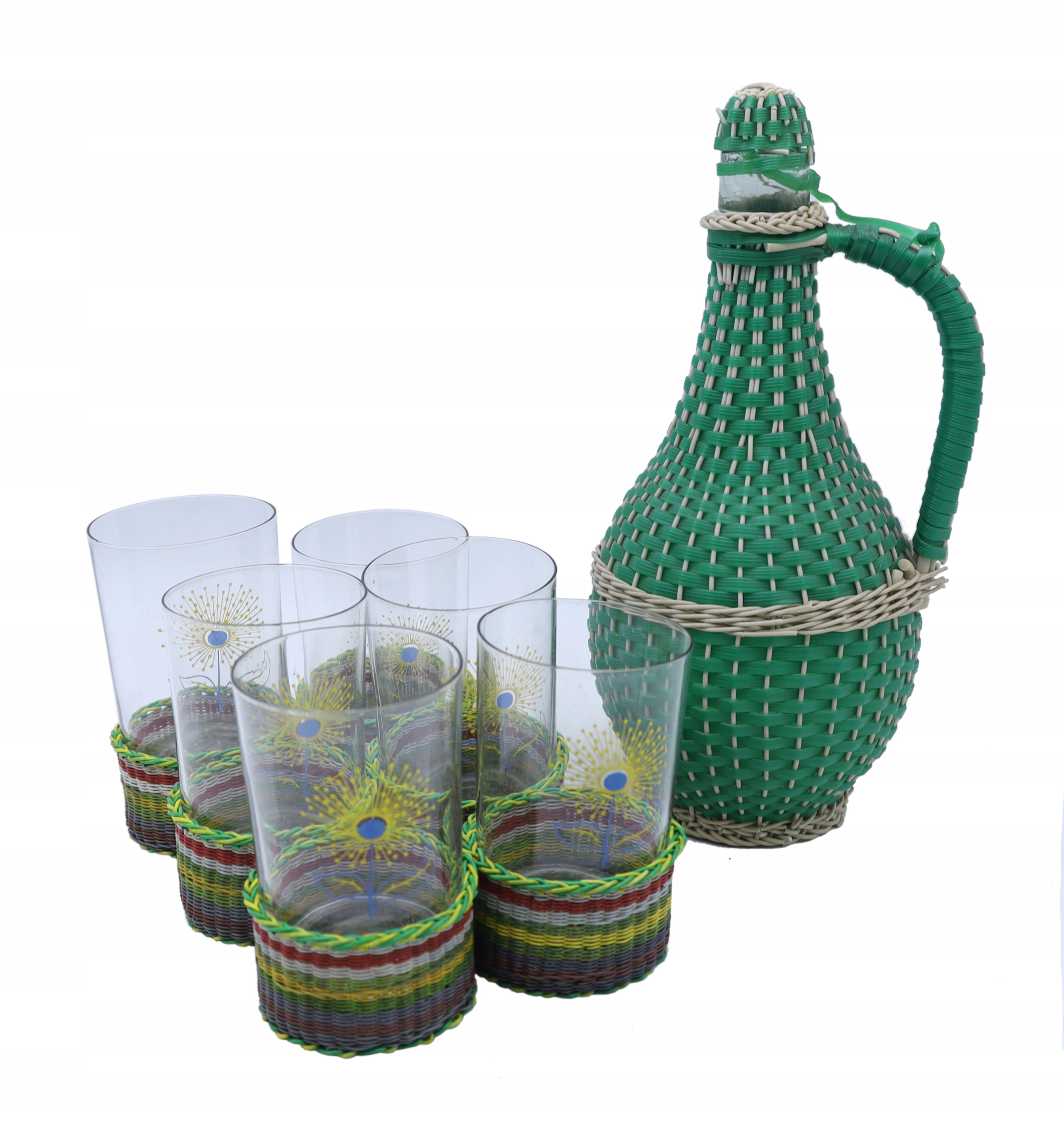 Набор из кувшина и 6 стаканов периода Польской Народной Республики. Следы использования, небольшой скол на одном из стекол. Стаканы различаются по высоте. Размеры: высота кувшина 27 х 11 см, стаканов 10,5-12 х 6,5 см. Рекомендую коллекционерам.