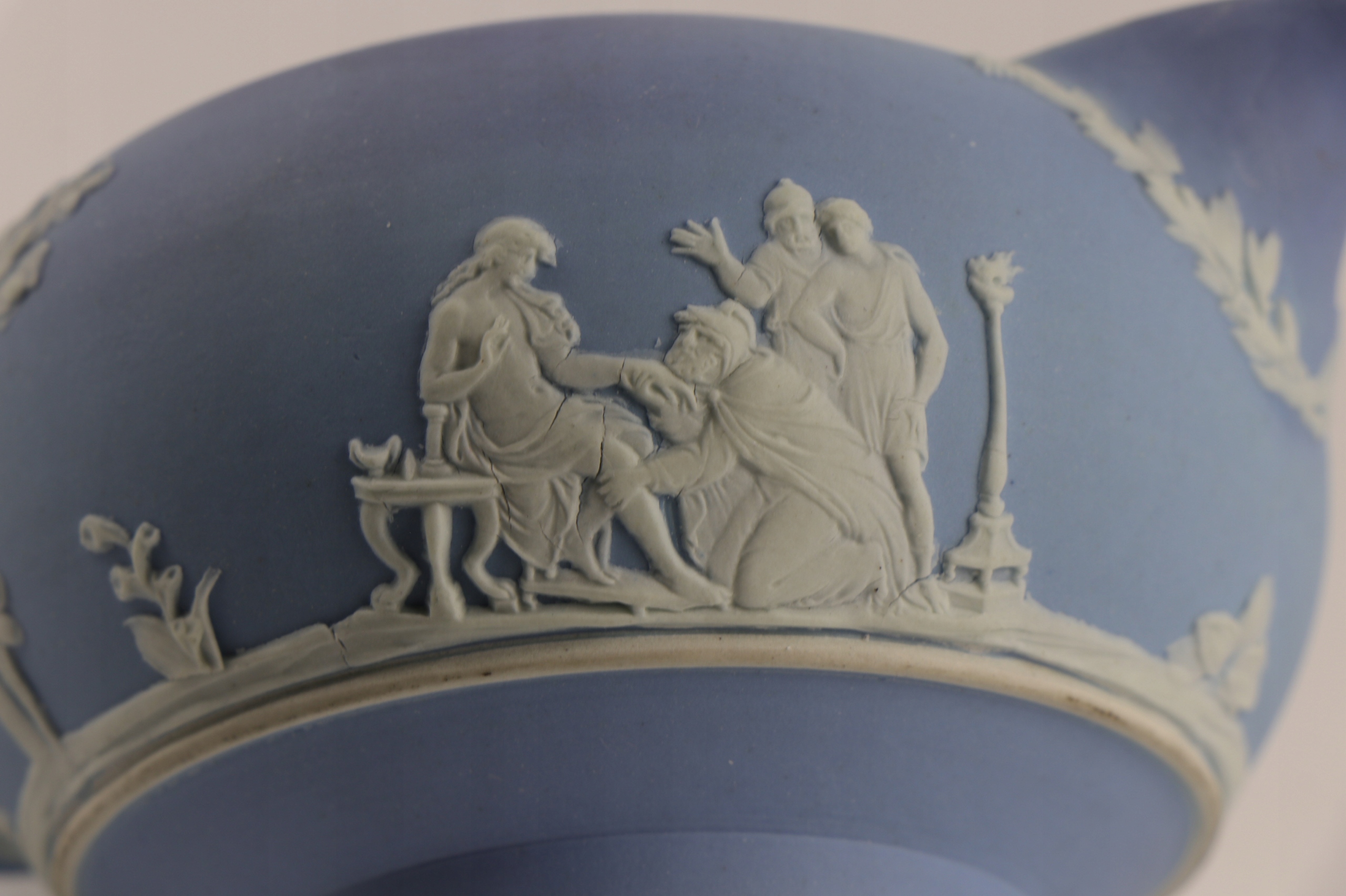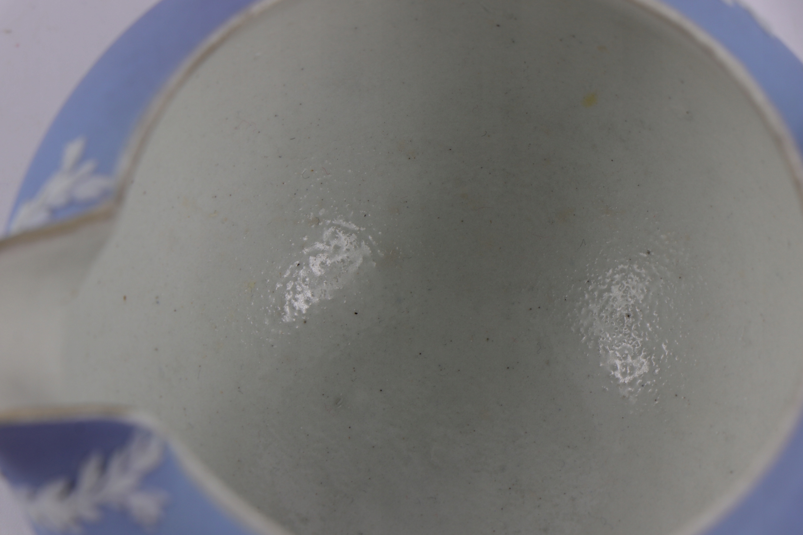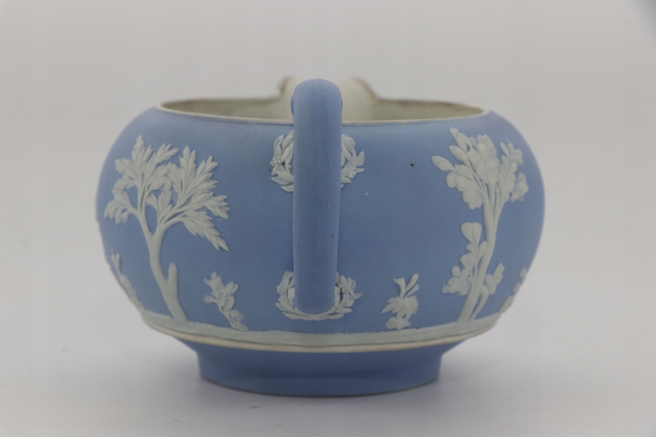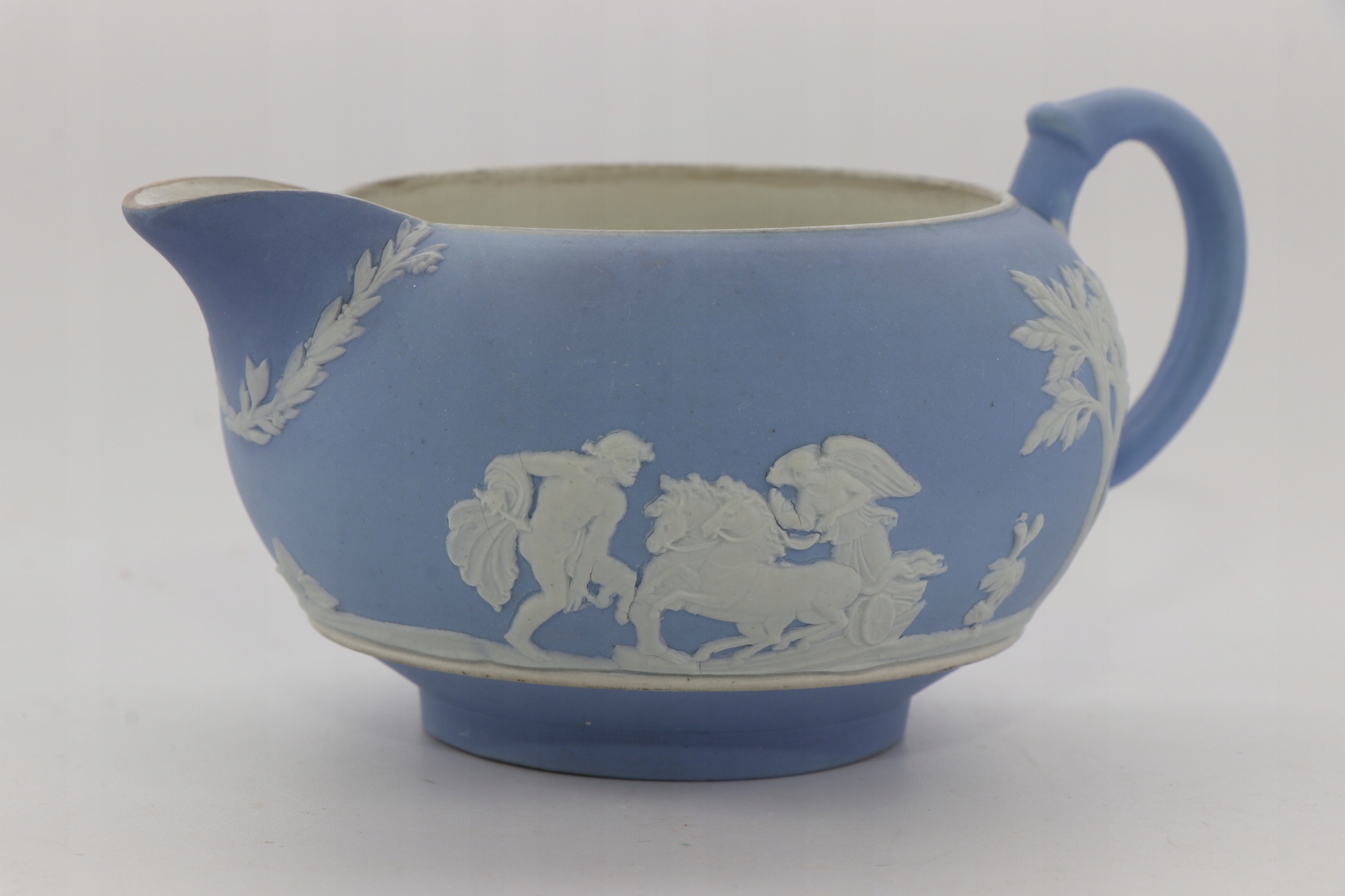 Фарфоровый молочник Wedgwood из синей яшмы. Украшен рельефными бляшками с изображением старинных фигур. Застекленный интерьер.