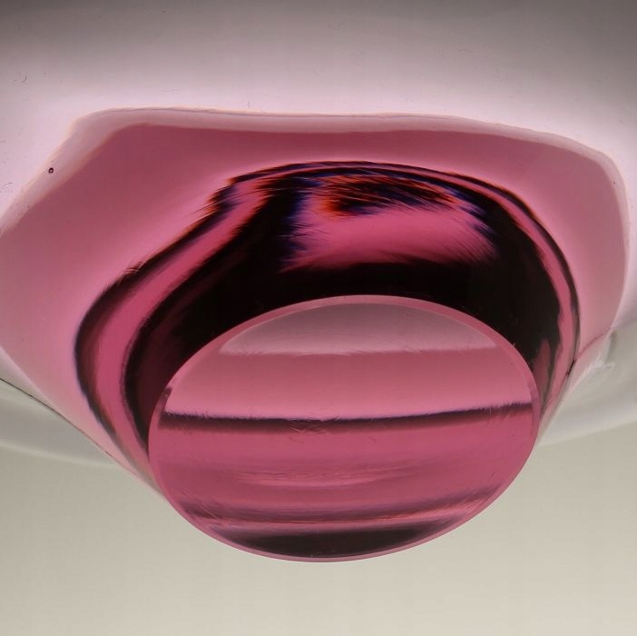 Пепельница на одну сигарету из натриевого стекла ручной формовки, окрашенного в массе в розовый цвет. Произведено лейблом «Железный Брод». Предположительно это один из проектов Мирослава Клингера. Чехословакия, 1960-е годы.