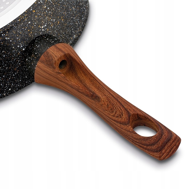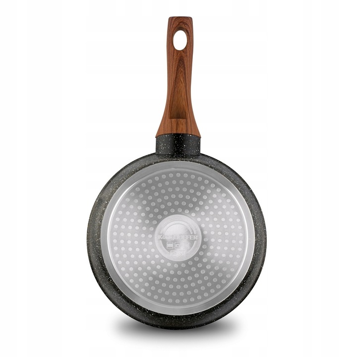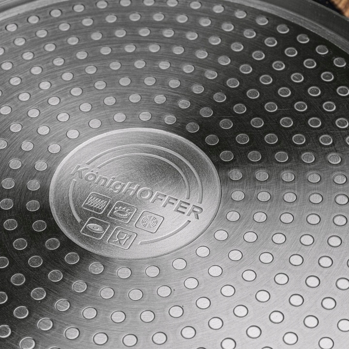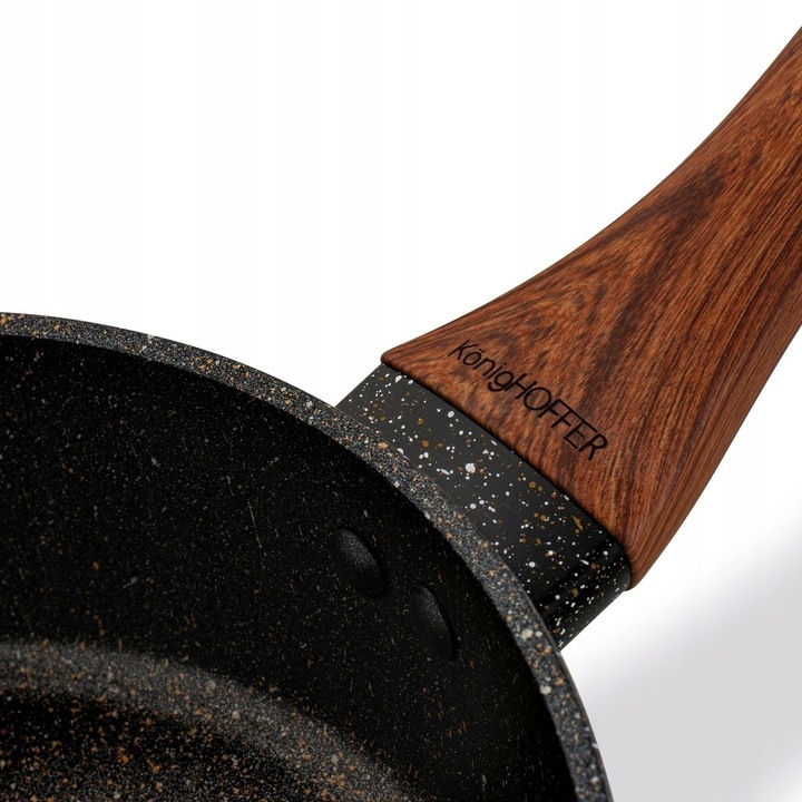 Индукционное дно (можно использовать на плитах любого типа). Чрезвычайно прочная конструкция из литого алюминия (горячекованого типа). Мраморная сковорода Pescado быстро нагревается и равномерно использует накопленное тепло. Трехслойное чрезвычайно твердое каменное покрытие, которое благодаря своей шероховатой поверхности еще более устойчиво к царапинам, истиранию и высоким температурам. Используемый эффект каменной пудры – Ball Blasting дополнительно укрепляет гранитную поверхность, что повышает комфорт использования. Глубокий профиль позволяет комфортно смешивать большое количество ингредиентов и готовить больше элементов блюда. Изделие легко чистить и обслуживать. Изысканный дизайн, включающий, среди прочего, деревянную ручку. Мягкая на ощупь ручка не нагревается и предотвращает случайное выскальзывание сковороды из рук во время переноски. Продукт рекомендует Ева Вахович. Как амбассадор бренда Konighoffer, она горячо и с улыбкой рекомендует его для домашнего использования. Вместе с ним вы получите свой рецепт для дома. Это один из лучших вариантов в этой категории!