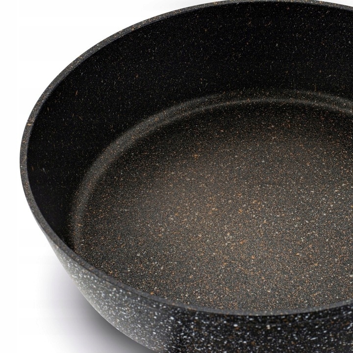 - сковорода из литого алюминия, покрытая антипригарным покрытием Ball Blasting с крапчатыми частицами черного гранита