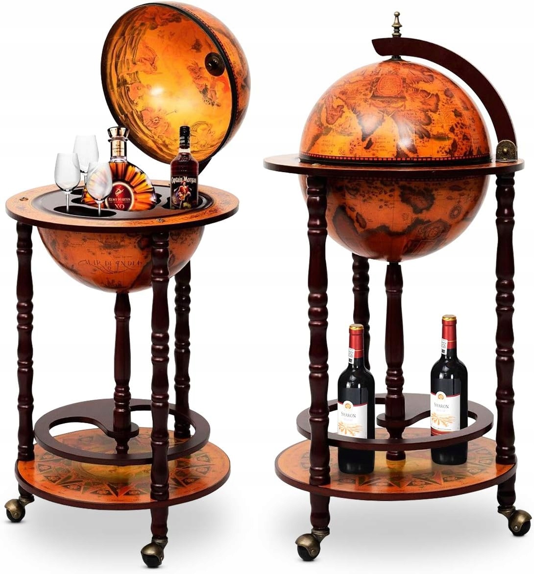 Этот элегантный шар -обратный бар идеально подходит для многих бутылок и очков. Домашний бар на колесах для дома, офиса или везде, где вы хотите принять гостей. Эта винная стойка очень уникальна. В баре в форме глобуса есть глобус, как вы можете видеть на фотографиях, на которых вы можете положить не только бутылки вина, но и бокалы для вина. Вы можете спрятать в нем несколько замечательных вещей, таких как цветы, чтобы удивить любовь. Благодаря 3 -го колесам можно легко перенести тележку с баром. Глобус изготовлен из пластика для открытия. Этот ювелирный шкаф - идеальный выбор
