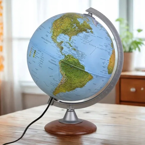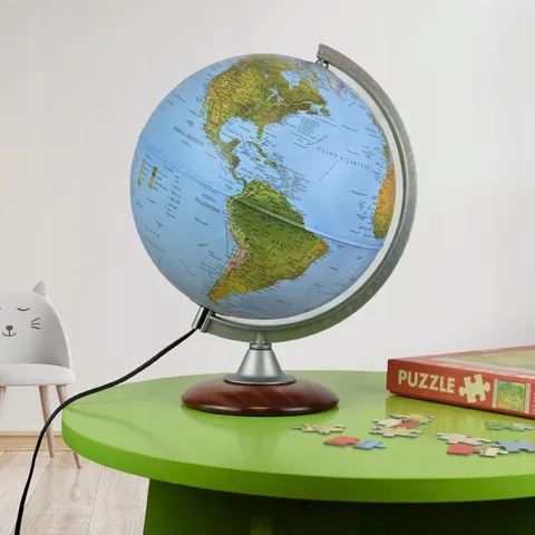 Глобус установлен на прочной деревянной основе и оснащен пластиковым меридианом. Карта подготовлена на польском языке. Диаметр шара 25 см, а общая высота глобуса 36 см. В модели Атлантис используется энергосберегающее светодиодное освещение, благодаря которому глобус может выполнять не только образовательную, но и декоративную функцию. Неброское освещение придает интерьеру вневременной стиль, подчеркивая гармонию помещения. Благодаря этому его можно использовать как оригинальный светильник, знакомящий вас с мечтами о путешествиях.