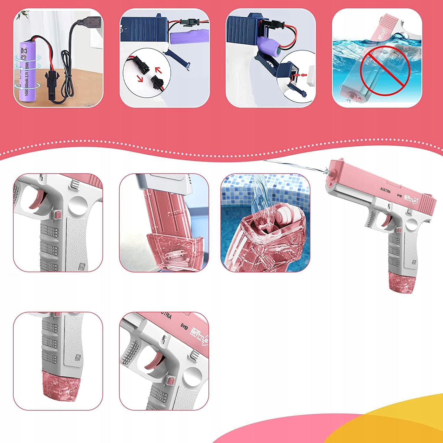 Два варианта цвета для командной игры: розовый и синий, водяной пистолет Glock упрощает управление. различать разные команды во время водных сражений. Водяной пистолет для взрослых имеет два водонепроницаемых слоя, которые позволяют кратковременно подвергаться воздействию воды, не повреждая электронные компоненты. Однако водяной пистолет для взрослых не следует погружать в воду на длительное время, чтобы избежать повреждений.