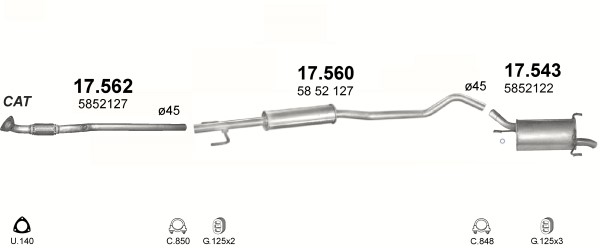 на этом аукционе продает набор глушителей (средний +финал) с № 17.560 + 17,543 + набор резиновых вешалок (5 шт. X G.125) + два зажима для Opel Corsa C в бензиновых двигателях с емкостью 1,2i - 16 В мощность 55 кВт/75 л.с. + 59 кВт/80 л.с. + емкость 1,4i -16V модели 66 кВт/90 л.с. с 2000 по 07/2006 Кроме того, он предлагает катализатор, трубу с гибким разъемом, набор резиновых вешалок и монтажную пасту. Эти глушители изготовлены из алюминия из листового металла и производится польским производителем PolmoStrow или взаимозаменяемого ферроза. Продукт имеет одобрение TUV и сертификат ISO 9001: 2001 + PIMOT и наполнение волокна, что дает поведение заводского звучания