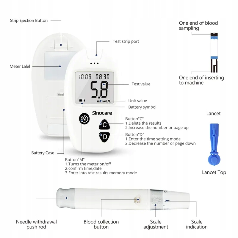 • 【Портативный и компактный】Монитор уровня сахара в крови Sinocare имеет компактное название, его удобно носить с собой каждому пользователю дома или в путешествии, что позволяет удобно измерять уровень сахара в крови.