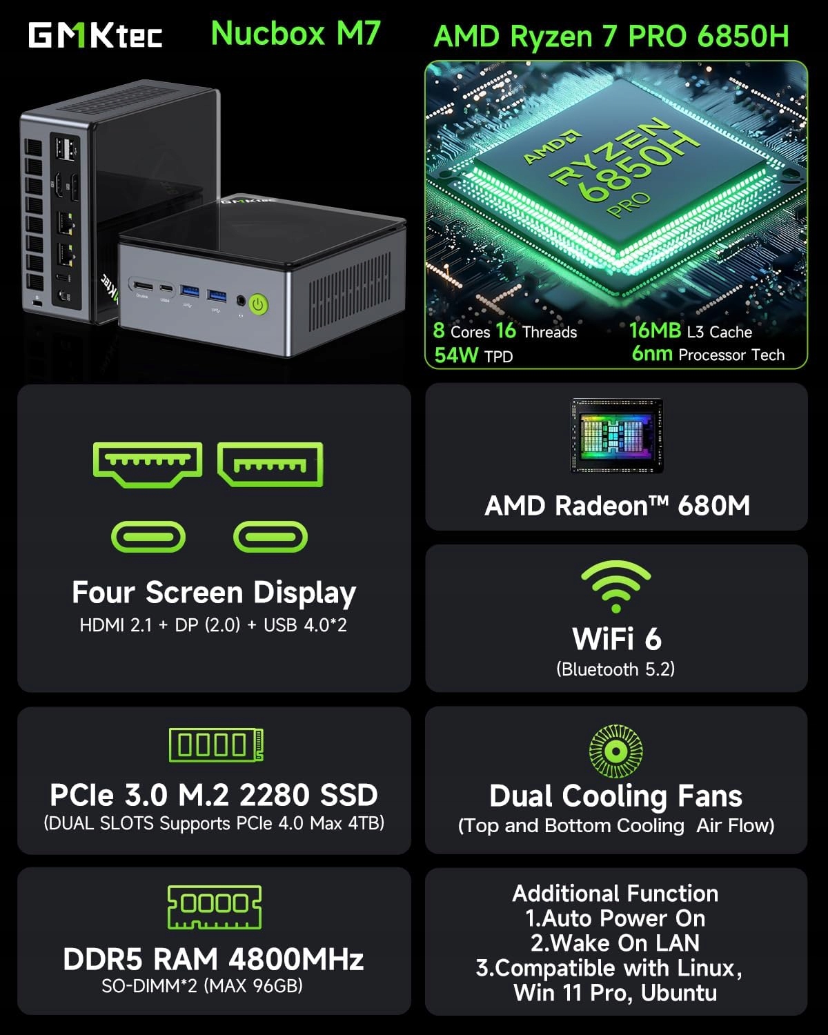 Gmktec m7 mini pc amd ryzen 7 pro 6850h win11 ddr5 wi -fi6/bt5.2 babeles