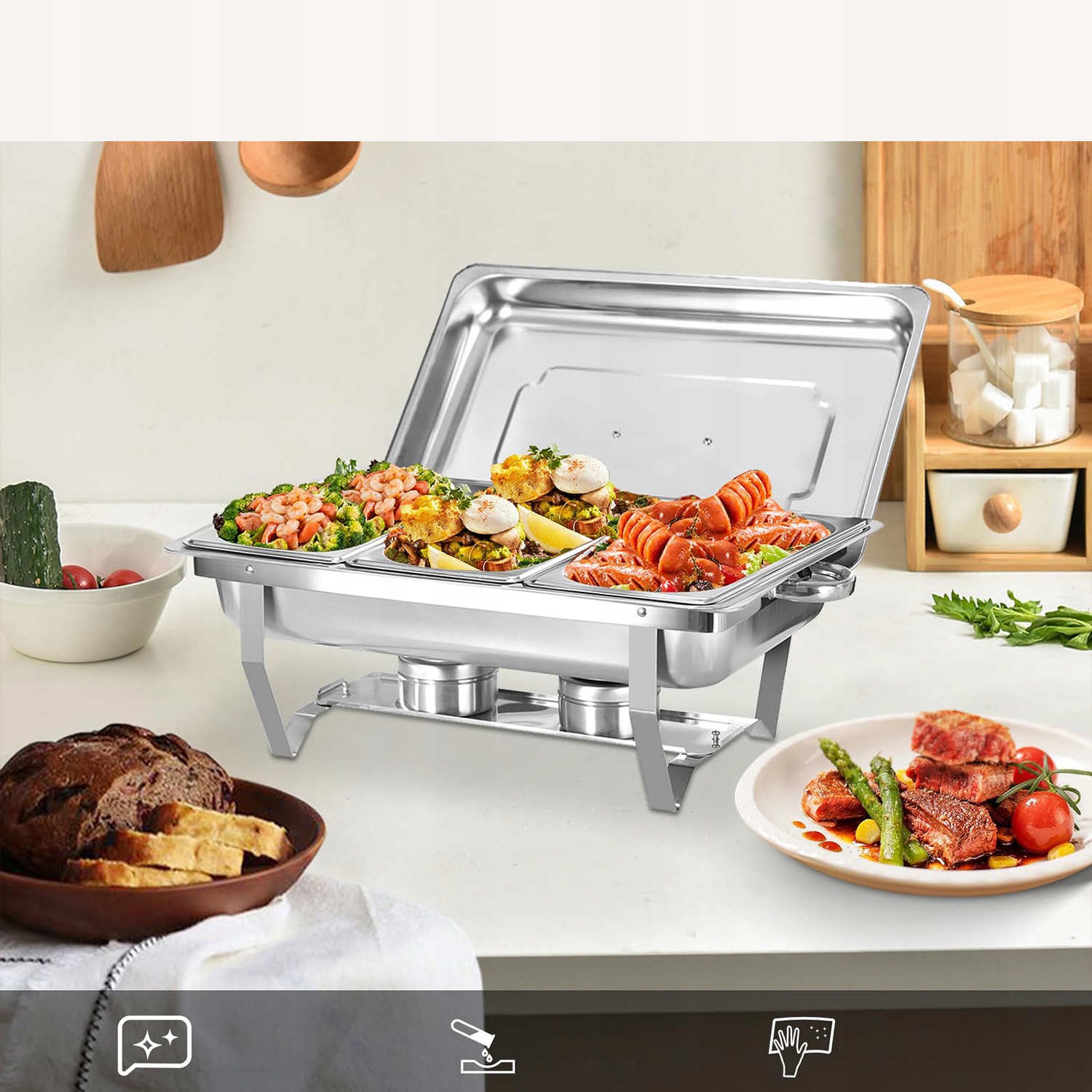 【Широкое применение】 Мармит идеально подходит для заведений самообслуживания, таких как фуршеты, залы для завтраков, бранчи, банкеты, вечеринки и свадьбы.