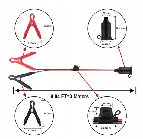 Гнездо прикуривателя с зажимами типа «крокодил» длиной 3 метра — уникальное устройство, позволяющее удобно пользоваться электроприборами в автомобиле независимо от их расположения внутри/снаружи автомобиль. Удлинительный кабель изготовлен из высококачественного кабеля из чистой меди 16 AWG, что обеспечивает не только эффективную электропроводность, но также исключительную долговечность и устойчивость к повреждениям.