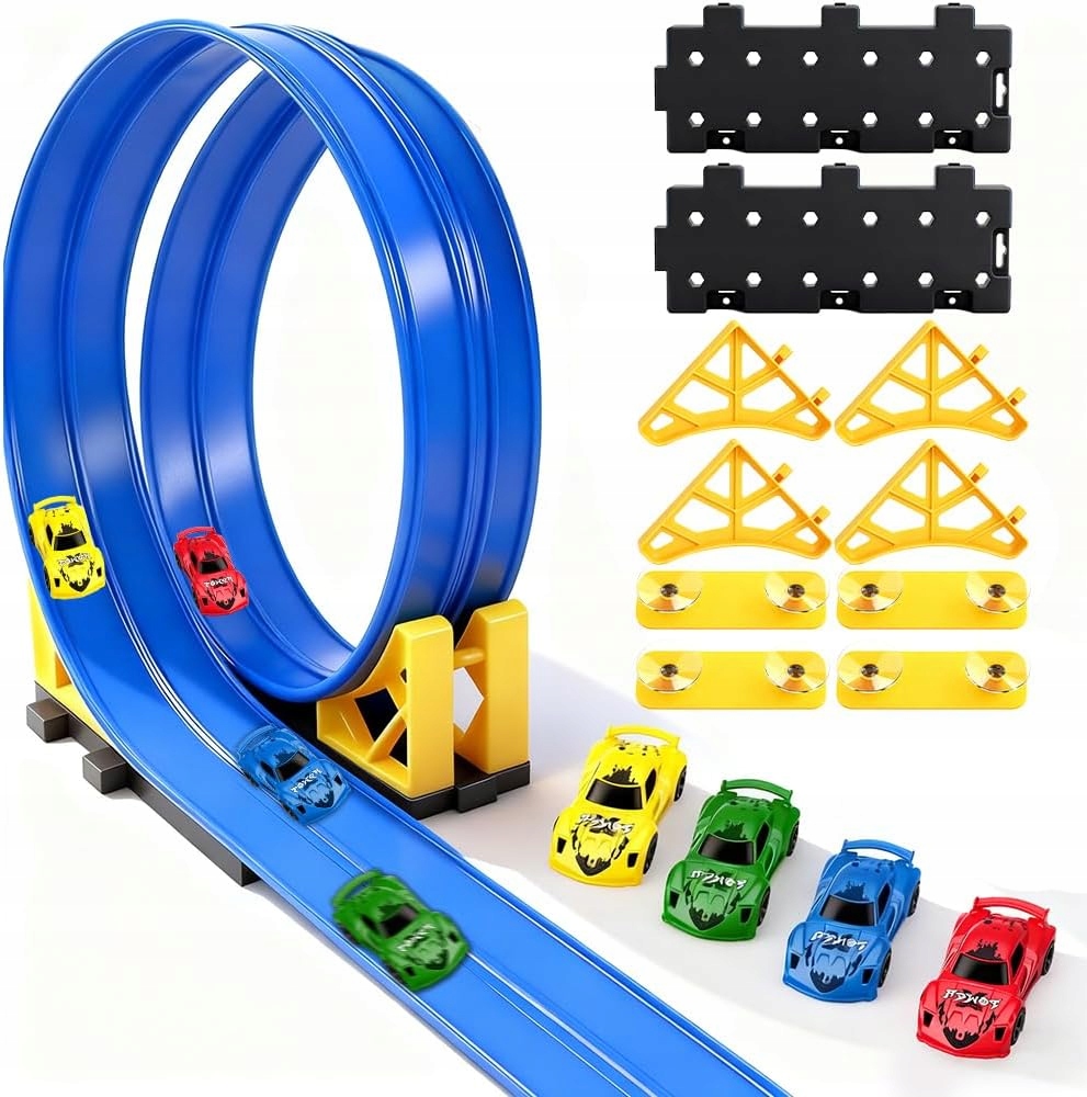 В комплект входят целых 5 метров двойной гоночной трассы, четыре машинки и присоски для крепления на гладких поверхностях. Это ваш путь к захватывающим гонкам и безграничному творчеству — и все это в одной коробке!