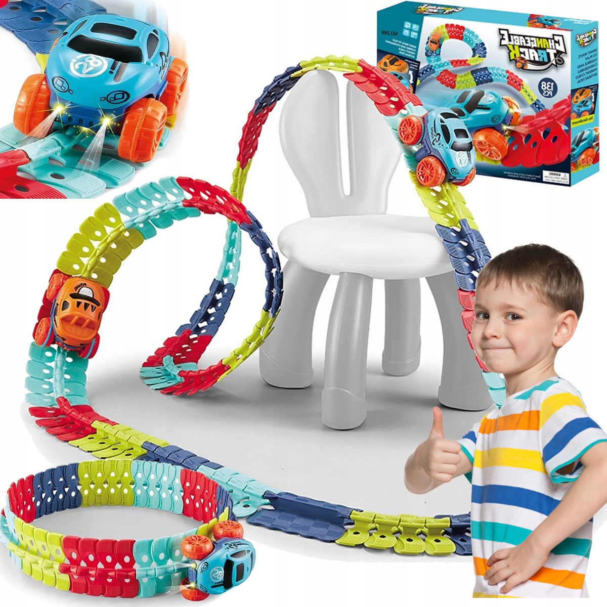 Дорожка состоит из отдельных элементов, соединенных между собой с помощью системы кликов. При сборке элементов вы можете создать трассу любого цвета и свободно определять маршрут после сборки всех элементов. Конечно, вы можете расширить и увеличить трек, приобретя дополнительные комплекты.
