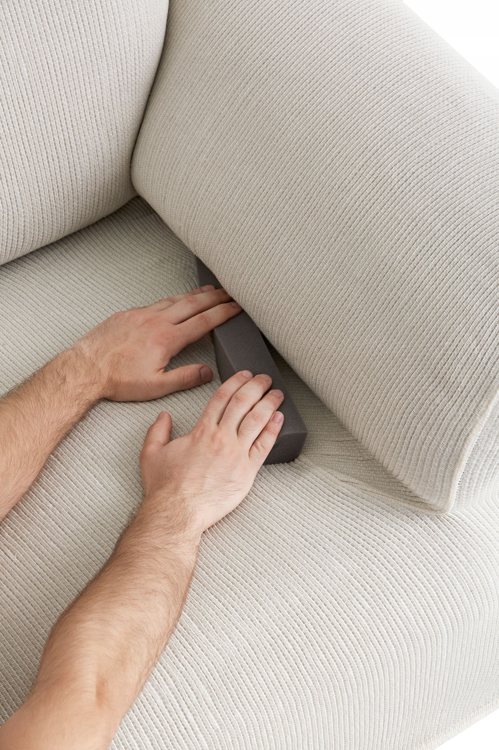 Благодаря складкам текстура толстого материала становится более плоской в местах наибольшей нагрузки, но материал никогда не станет тоньше. Даже большой контраст между мебелью и чехлом не влияет на темный цвет снизу.