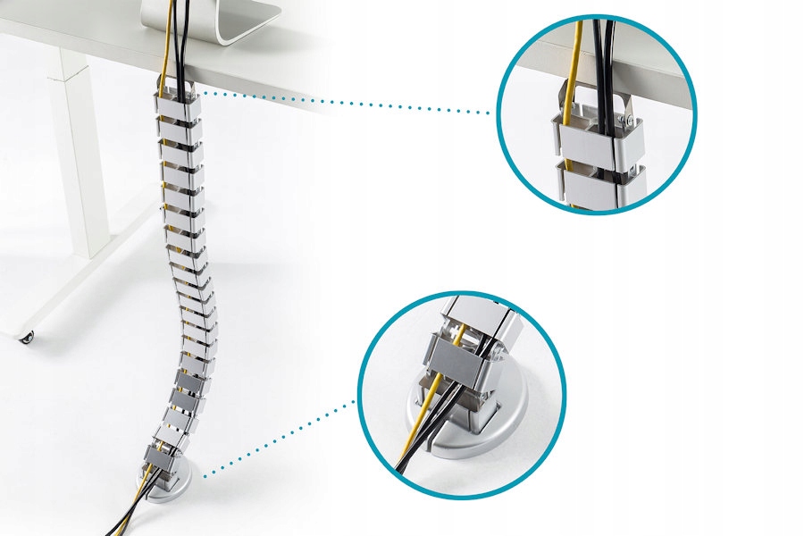 — идеальное решение не только для столов с регулируемой высотой. Отдельные элементы при необходимости можно удалять или добавлять, поэтому их длину можно индивидуально подогнать под максимальную высоту стола. При опускании регулируемого по высоте стола кабельная направляющая складывается, чтобы предотвратить запутывание кабелей, а утяжеленное металлическое основание удерживает кабельную направляющую устойчиво на полу. Стол крепится с помощью ручки, расположенной на верхнем конце кабельной катушки. Максимальная высота стола до 130 см. В кабель-канале имеется 4 отдельных канала для аккуратной и чистой прокладки всех видов кабелей. Каждый модуль имеет гибкое отверстие для легкой установки и удаления кабелей.