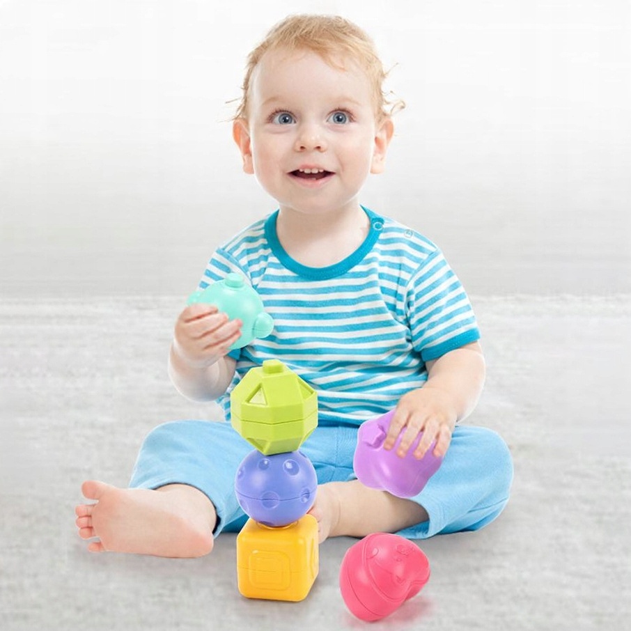 В наборе целых 6 кубиков – каждый имеет разную форму, фактуру и цвет. , что вызывает любопытство и побуждает к игре. Блоки можно вставлять и вынимать из сортировщика, проталкивая их через эластичные веревки или помещая в отверстия соответствующей формы.