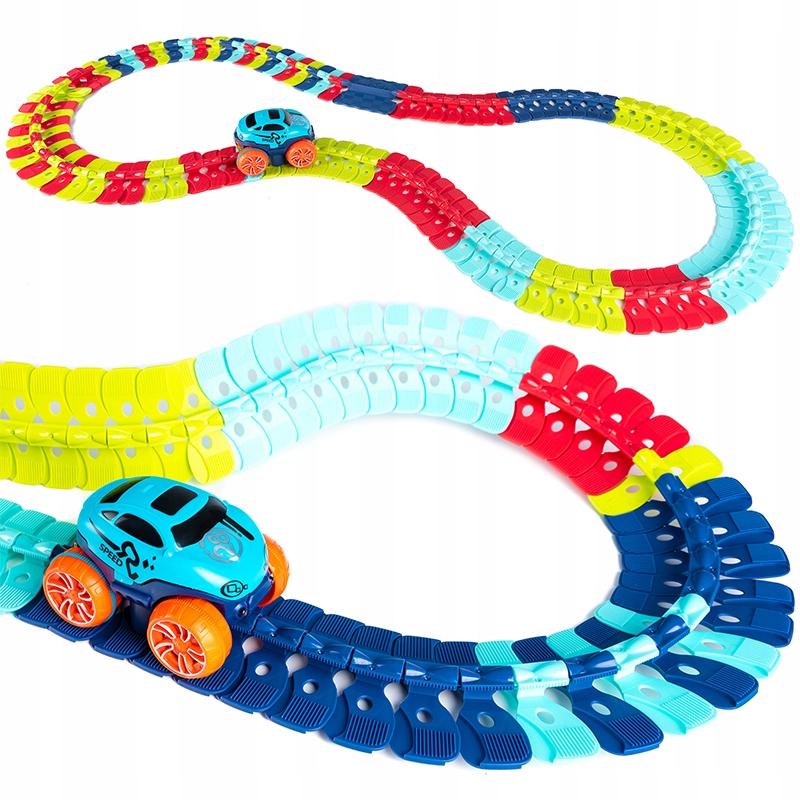 - В нашем наборе имеется уникальная система соединения сегментов дорожки, благодаря которой можно создавать любые фигуры, петли, повороты, и т. д.