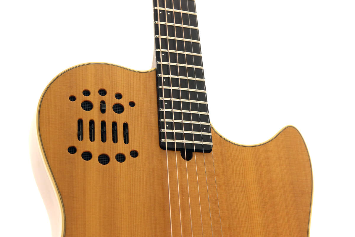 Этот инструмент был первым, у которого не было логотипа Godin на корпусе, а только логотип в виде подписи основателя бренда на грифе.