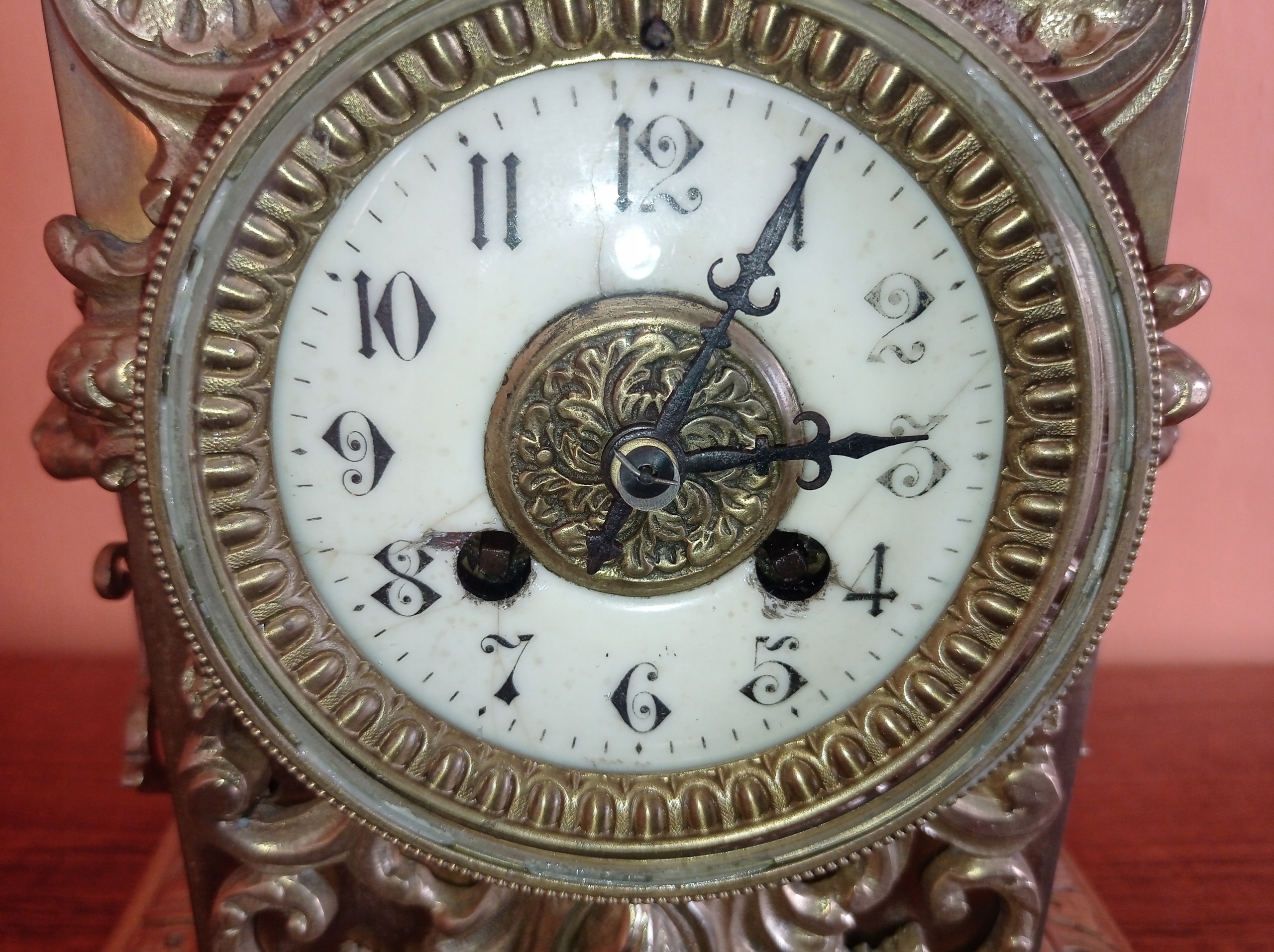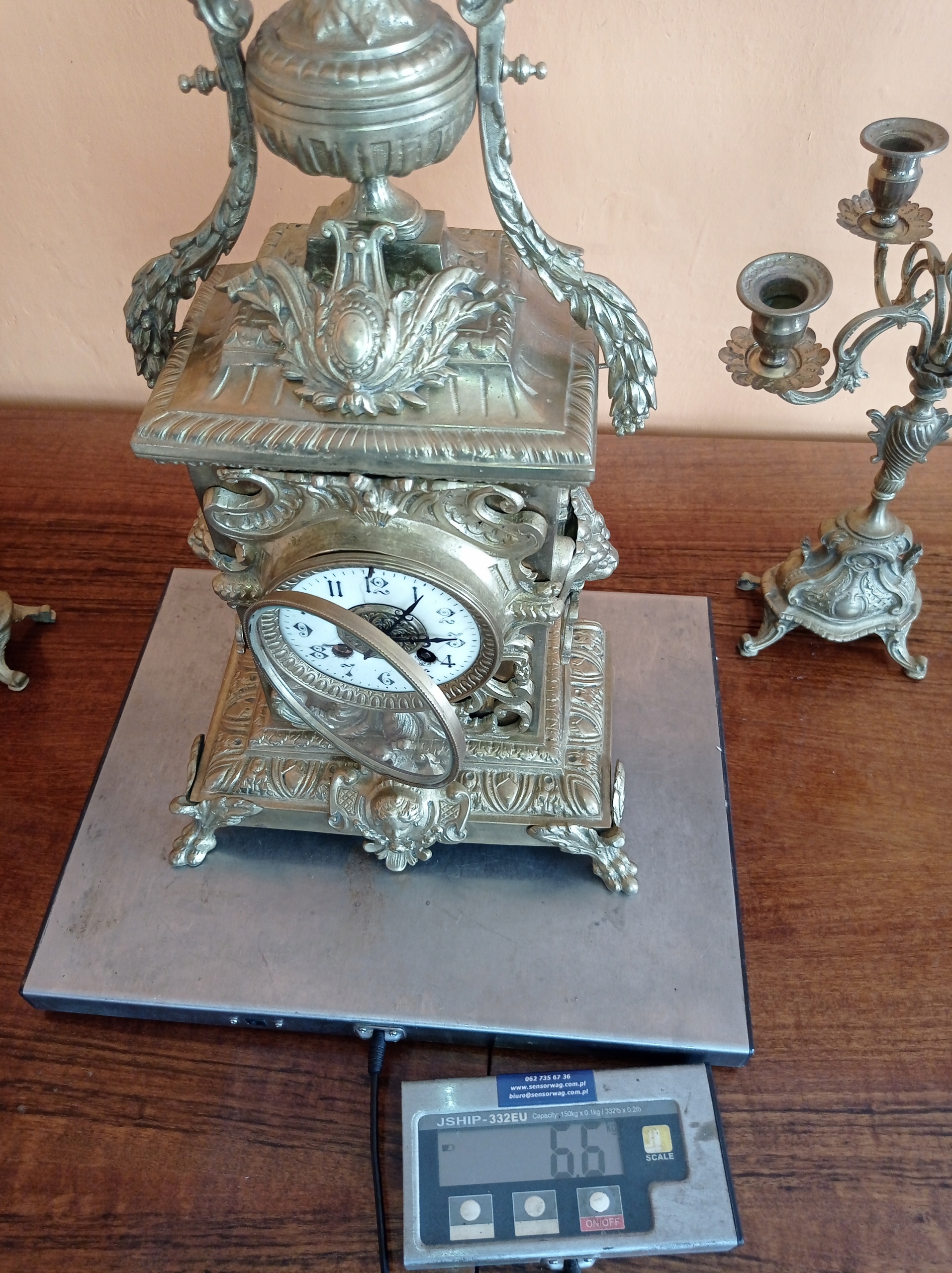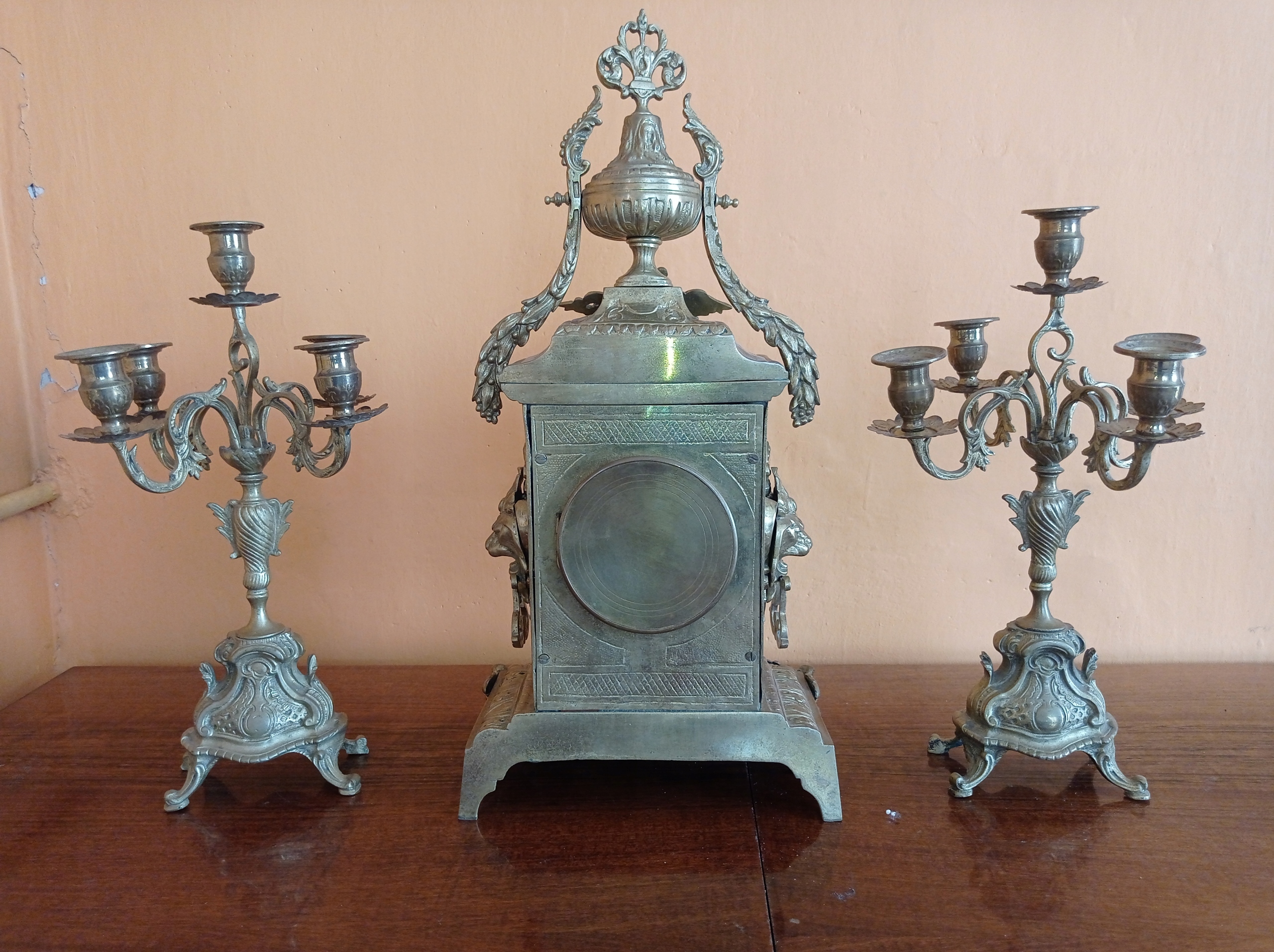 КРАСИВЫЕ СТАРЫЕ КАМИННЫЕ ЧАСЫ С МОЛОТКАМИ + 2 СВЕЧИ ЛАМПЫ, ИЗ ЗОЛОТОЙ БРОНЗЫ.