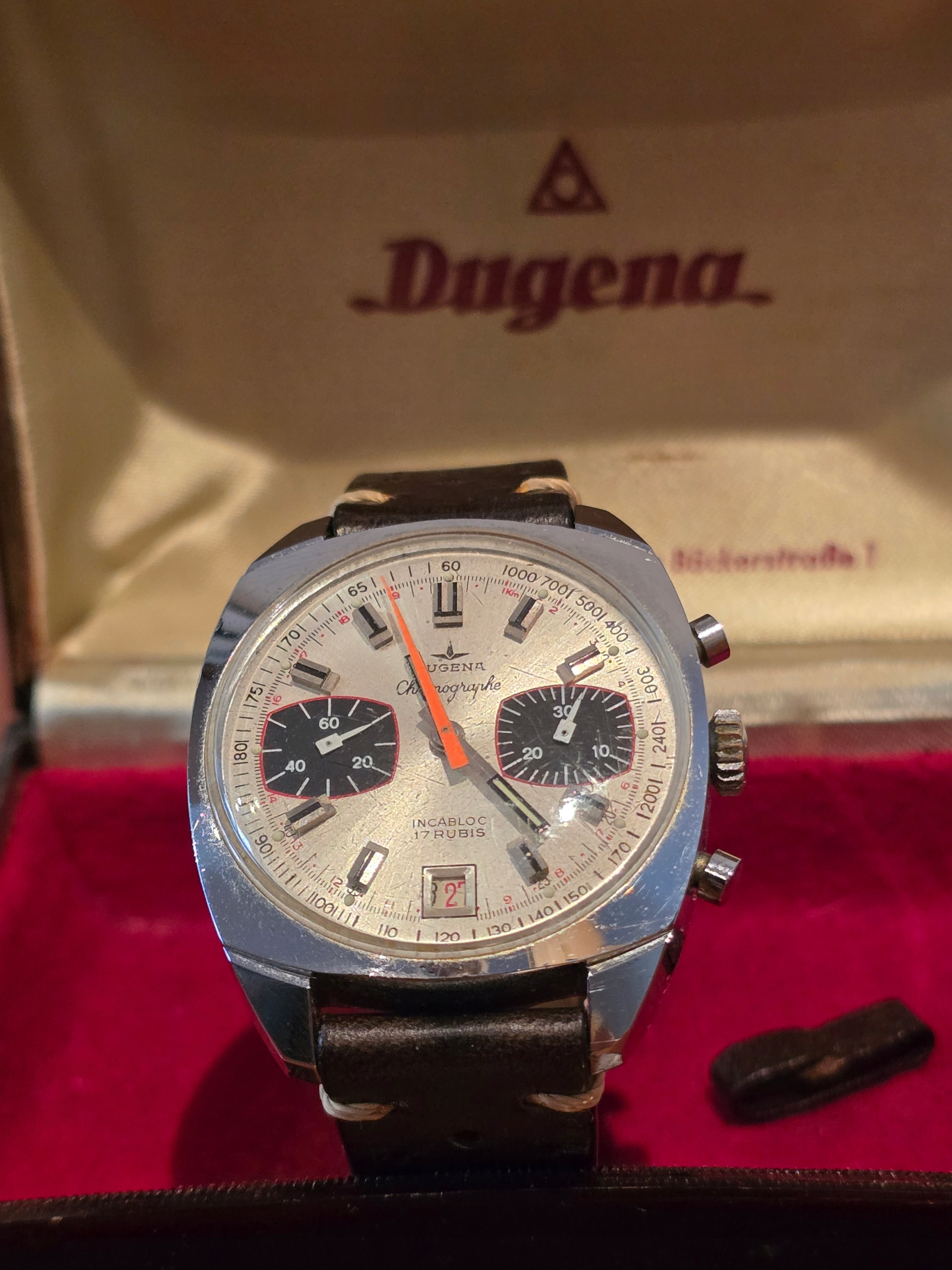 красивый хронограф Dugena с 70 -х годов, Dugen с механизмом Valjoux 7733 с заповедником примерно 40 часов, красивым изготовлением и вневременным дизайном делает его часами, которые только приобретают ценность. В дополнение к часам оригинальная упаковка