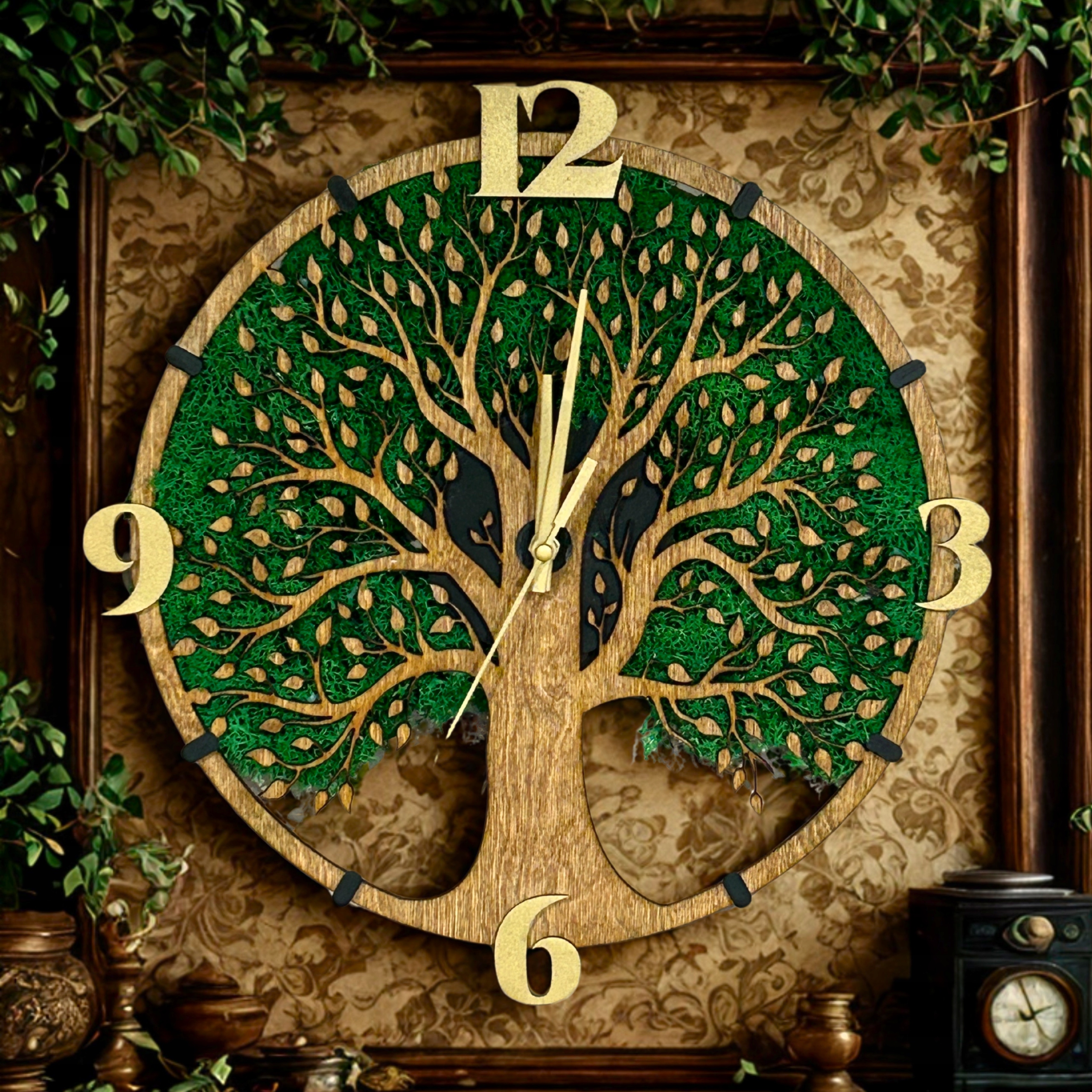 Часы диаметром 32 см впечатляют точностью лазерной резки и богатством деталей. Естественная структура древесины в сочетании с насыщенной зеленью хроботки создает гармоничную композицию, притягивающую взгляд и добавляющую теплоты и стиля в интерьер.