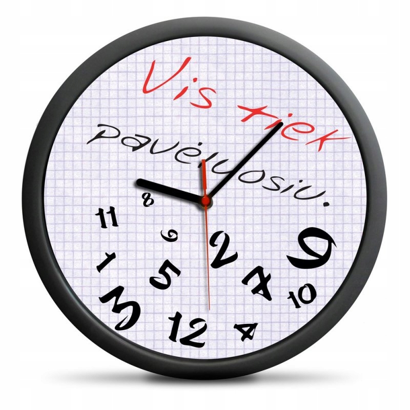 Надпись на продукте: Vis tiek pavėluosiu. Продукт в версии литовского языка. Материал: ABS покрыт прорезиненным покрытием, стекло. Размеры: 30 см (диаметр). Предупреждения: Батарея