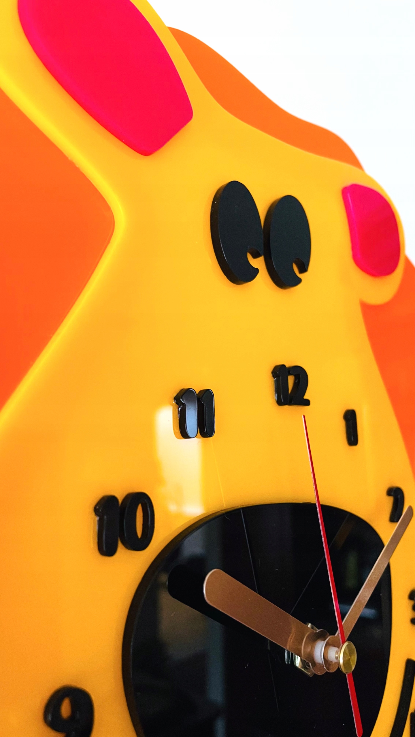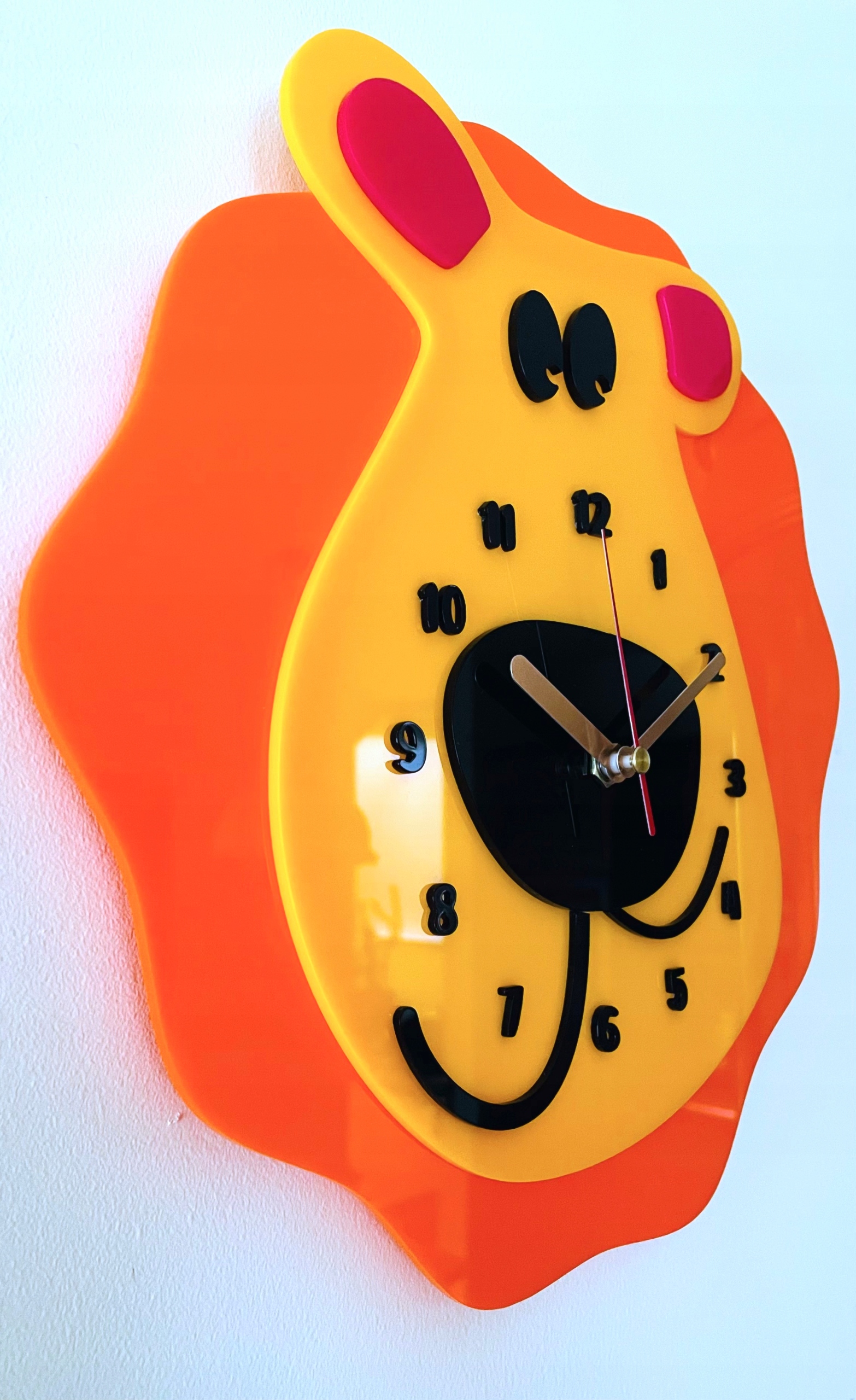 Настенные часы LION для детской комнаты, изображающие голову льва в виде щита, – это уникальный декоративный элемент, который сразу придает интерьеру теплый и дружелюбный характер. Весь щит имеет форму головы льва с мягко очерченной пышной гривой теплых оттенков желтого и оранжевого. Улыбающаяся мордашка льва создана нежно и дружелюбно и идеально подходит для комнаты малыша: животное больше похоже на сказочного друга, чем на опасного короля джунглей.