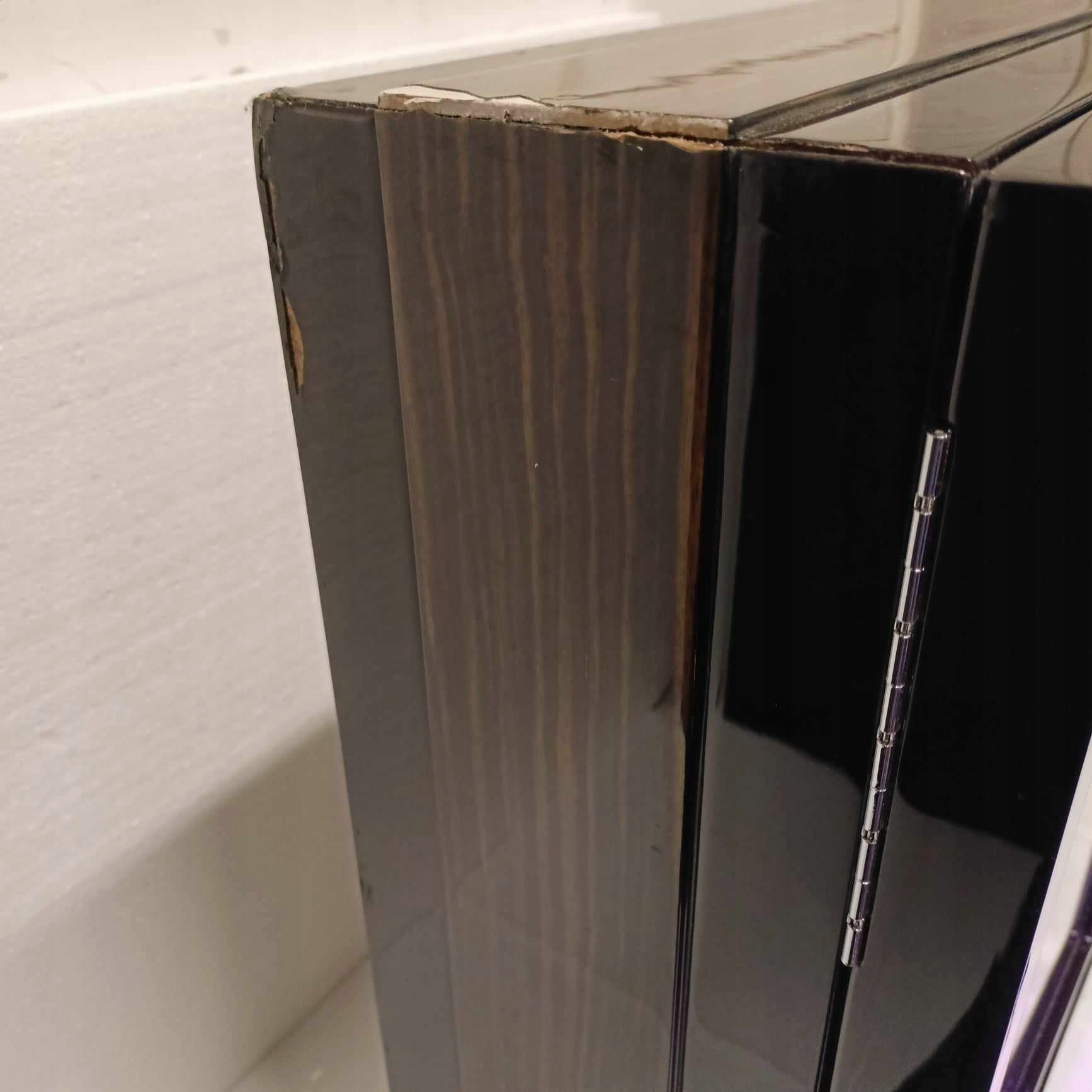 Элегантный деревянный презентационный футляр с черным лаковым покрытием. и черный, бархатная обивка внутри и черные подушки из пенопласта.