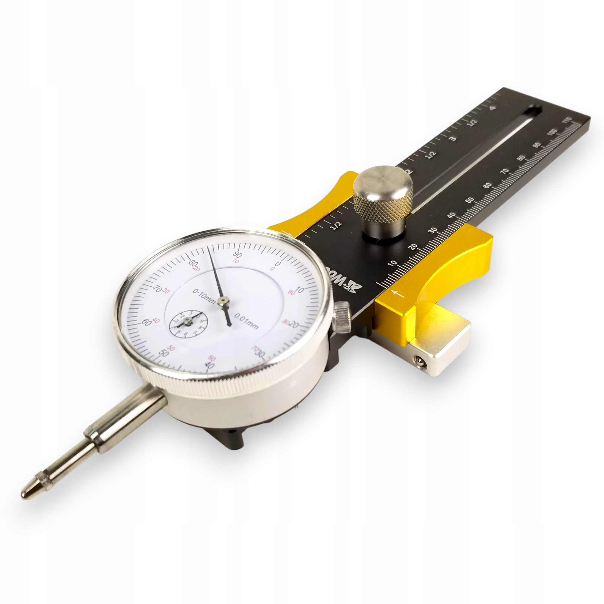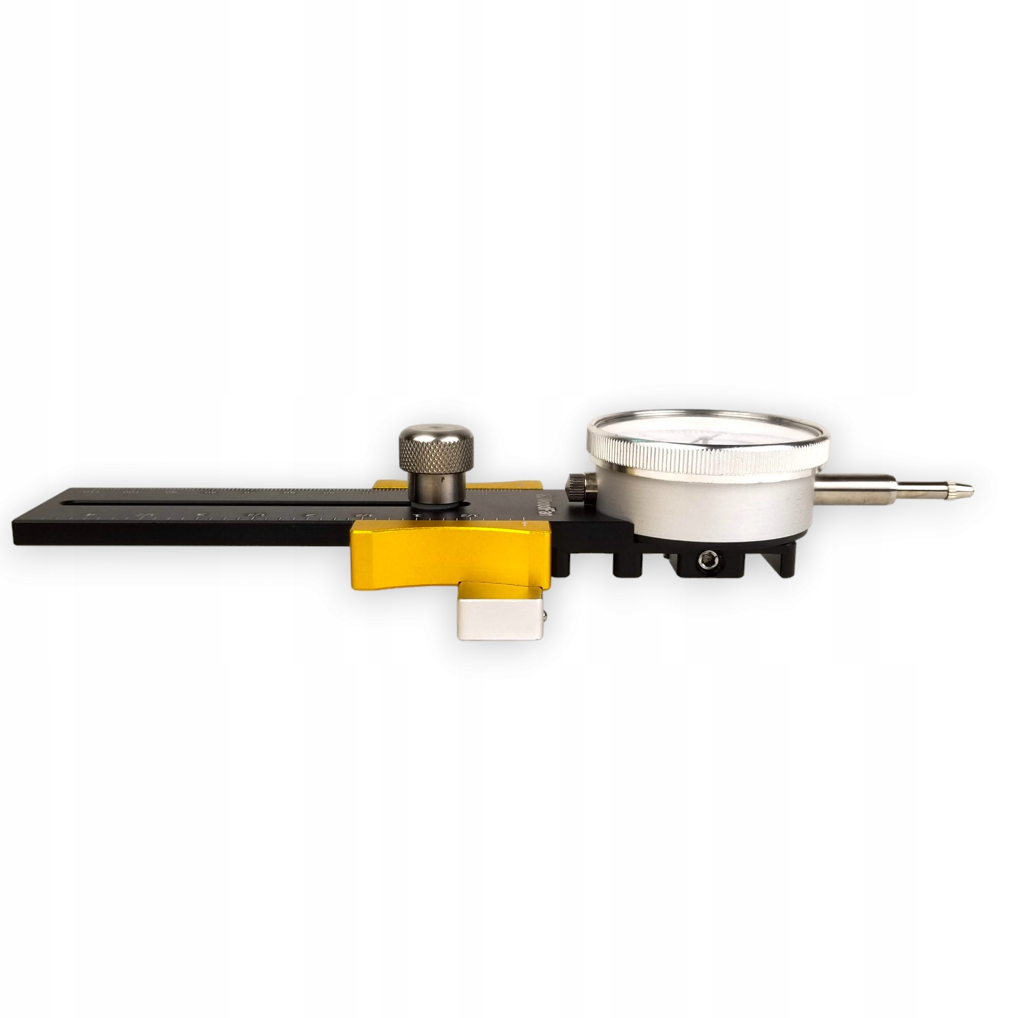 Измеритель имеет алюминиевый корпус с регулируемым радиусом действия до 110 мм. Благодаря направляющей 19 мм его можно устанавливать в пазы 19 мм настольных пил (например, Dewalt) и профилей Mitre Track 19/24 мм. Салазки регулируются по зазору.