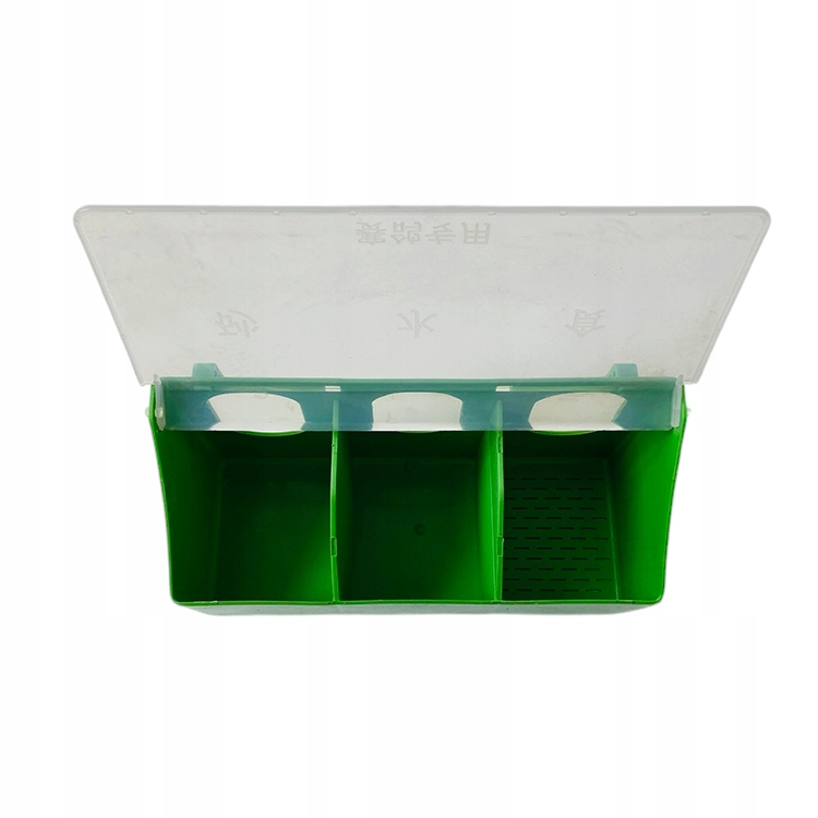 - Перегородки: Кормушка оснащена тремя отдельными отделениями, позволяющими одновременно подавать разные виды корма и воды.