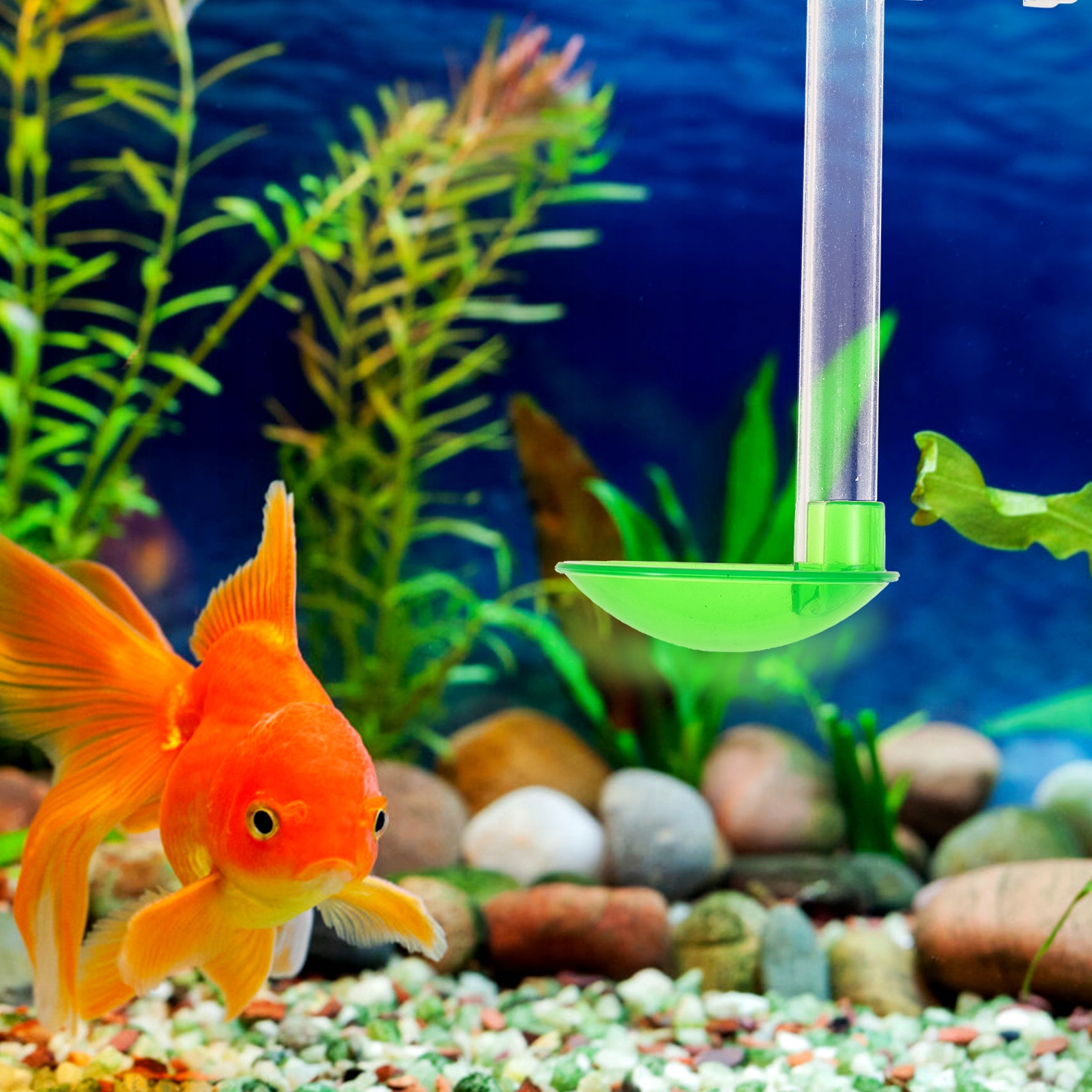 Этот продукт подходит для использования в аквариуме. Корм для рыб вводится через воронкообразное кормовое отверстие и медленно опускается в кормушку.