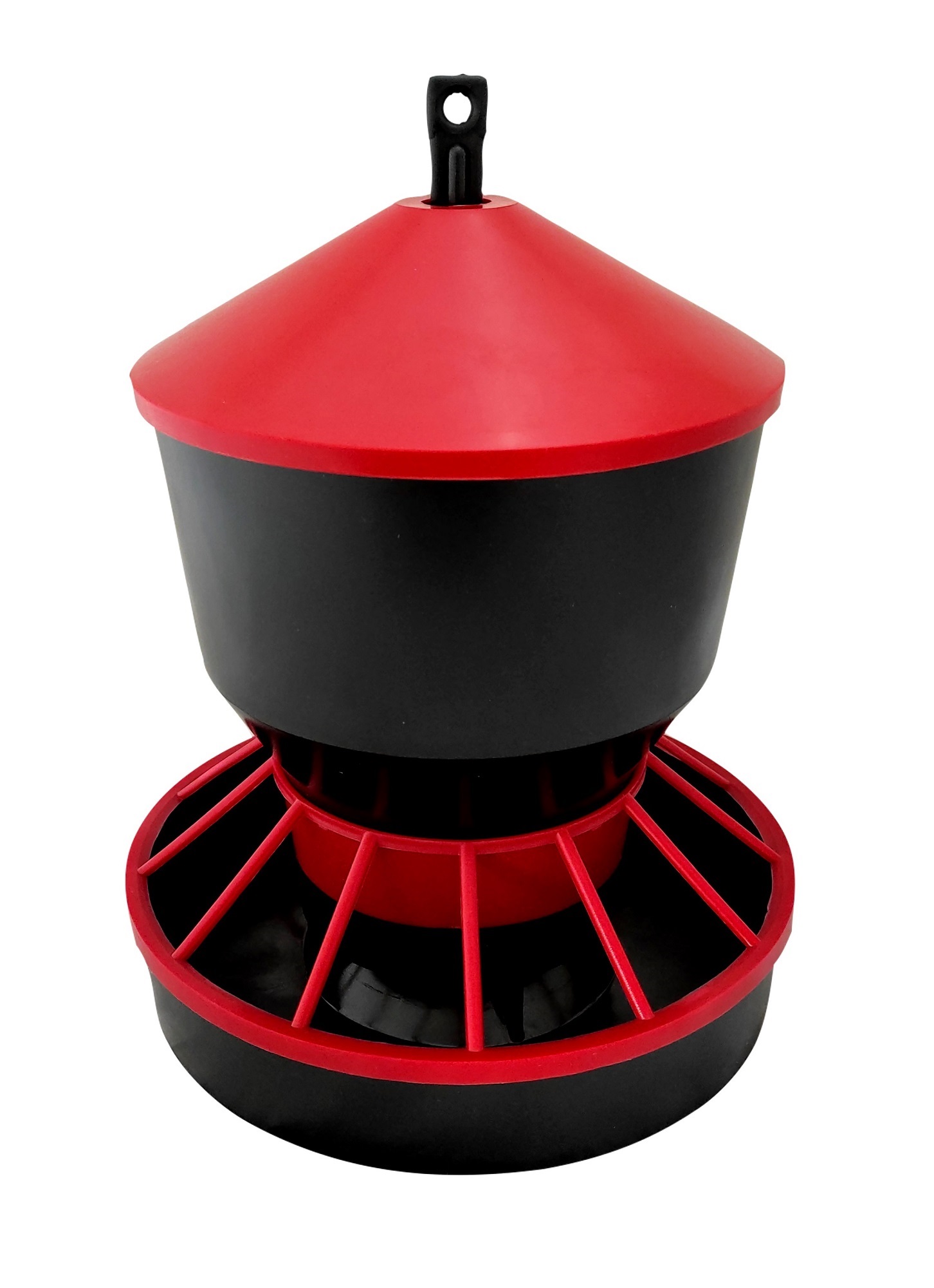 Кормушка состоит из пяти элементов: основания, контейнера для корма, решетки с весами, крышки и нарезного колышка с ручкой. Подходит для всех видов домашней птицы. Чаша имеет решетку, которая предотвращает выскальзывание еды. Кормушка отличается высоким качеством изготовления и очень высокой прочностью. Дополнительным преимуществом автомобиля является его устойчивость даже в полностью закрытом состоянии. Сама заправка очень проста: чтобы пополнить корм, вам просто нужно снять красную крышку. Используемый материал облегчает чистку.
