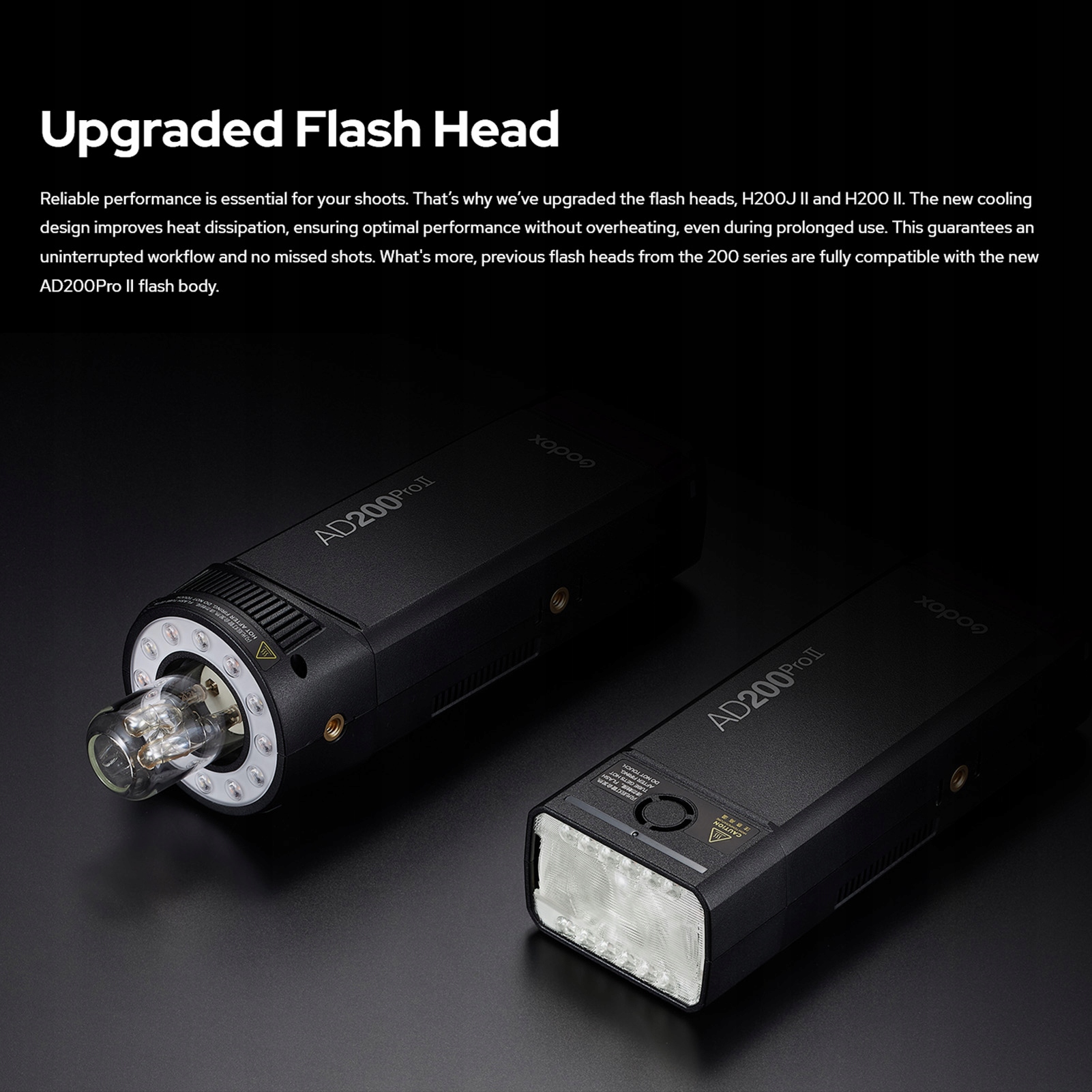 1. Улучшенная головка лампы: новая конструкция охлаждения улучшает рассеивание тепла, обеспечивая оптимальную производительность без перегрева, даже во время длительного использования. Это гарантирует непрерывный рабочий переход и отсутствие потерянных выстрелов. Более того, предыдущие вспышки из 200 -х серий полностью совместимы с новой Flash Flash AD200PRO II