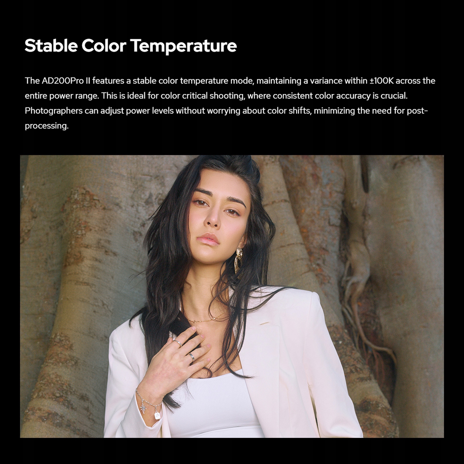 2. Тщательный выходной элемент управления выходом: AD200PRO II предлагает точное управление вспышкой, регулируемое от 1/512 до полной мощности (1/1) с увеличением 0,1. Этот уровень точности позволяет фотографам отрегулировать свое освещение, чтобы получить точные результаты