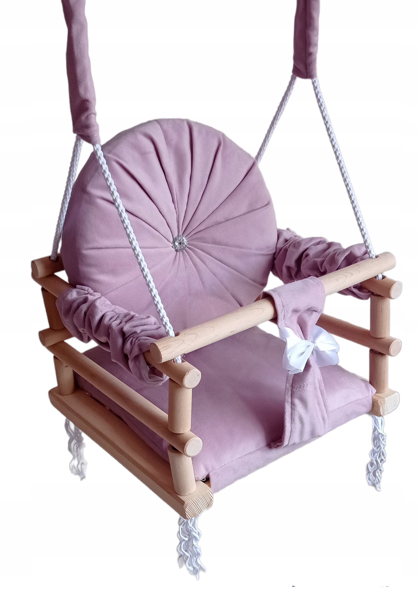 Качели подвешиваются на белых скрученных трехпрядных хлопчатобумажных веревках длиной 2 метра. С регулируемой длиной. Веревки обеспечивают безопасность нашего ребенка. Хлопковые веревки заканчиваются металлическим кольцом, которое можно повесить на крючки/колышки к потолку или дверным косякам, а также разместить на качелях на улице или на детской площадке. Монтажные крючки в комплект не входят. Их можно купить и на других наших аукционах.