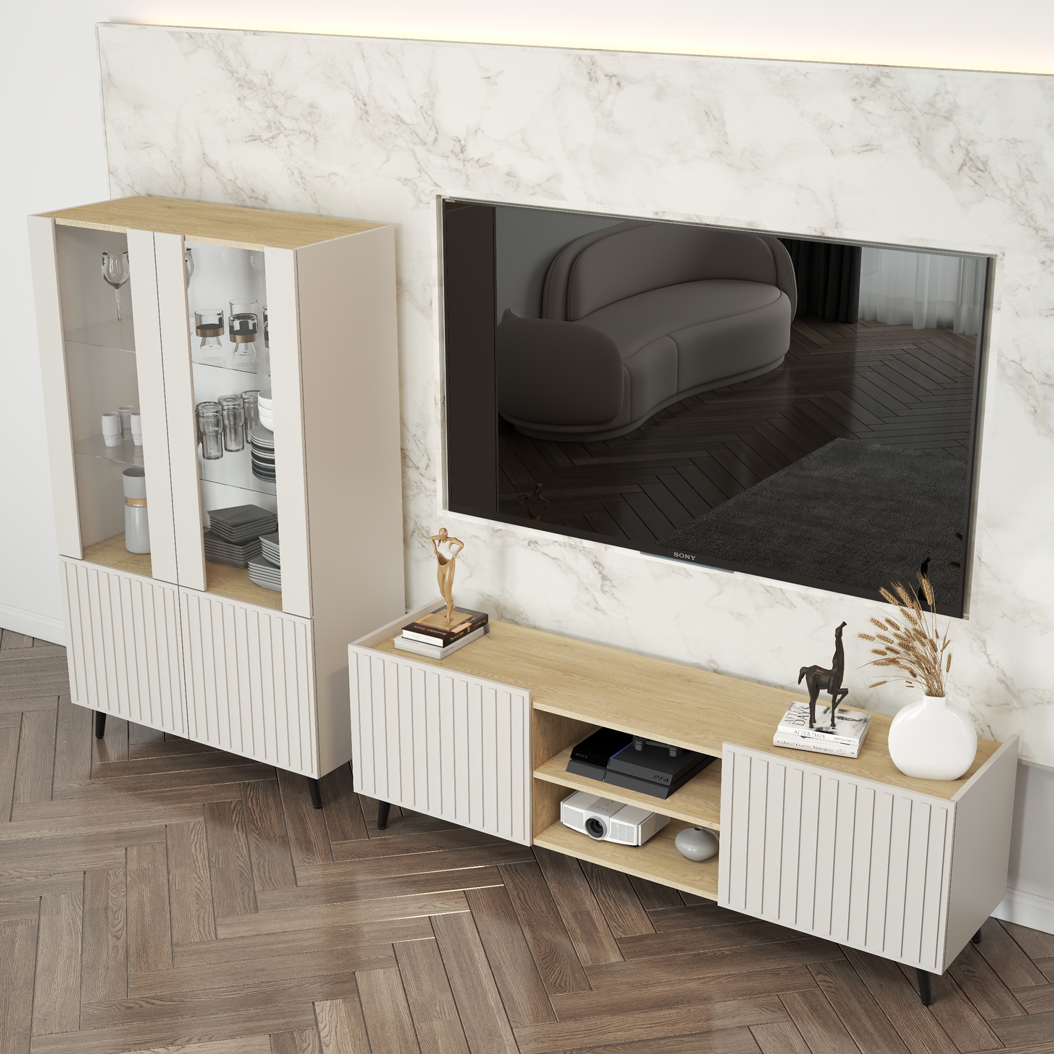 Goja - это стильный набор мебели, которая сочетает в себе элегантность, современный дизайн и функциональность, обеспечение гармонии и комфорта в любом интерьере. Набор состоит из 5 элементов , которые создадут идеальное пространство для отдыха и хранения.