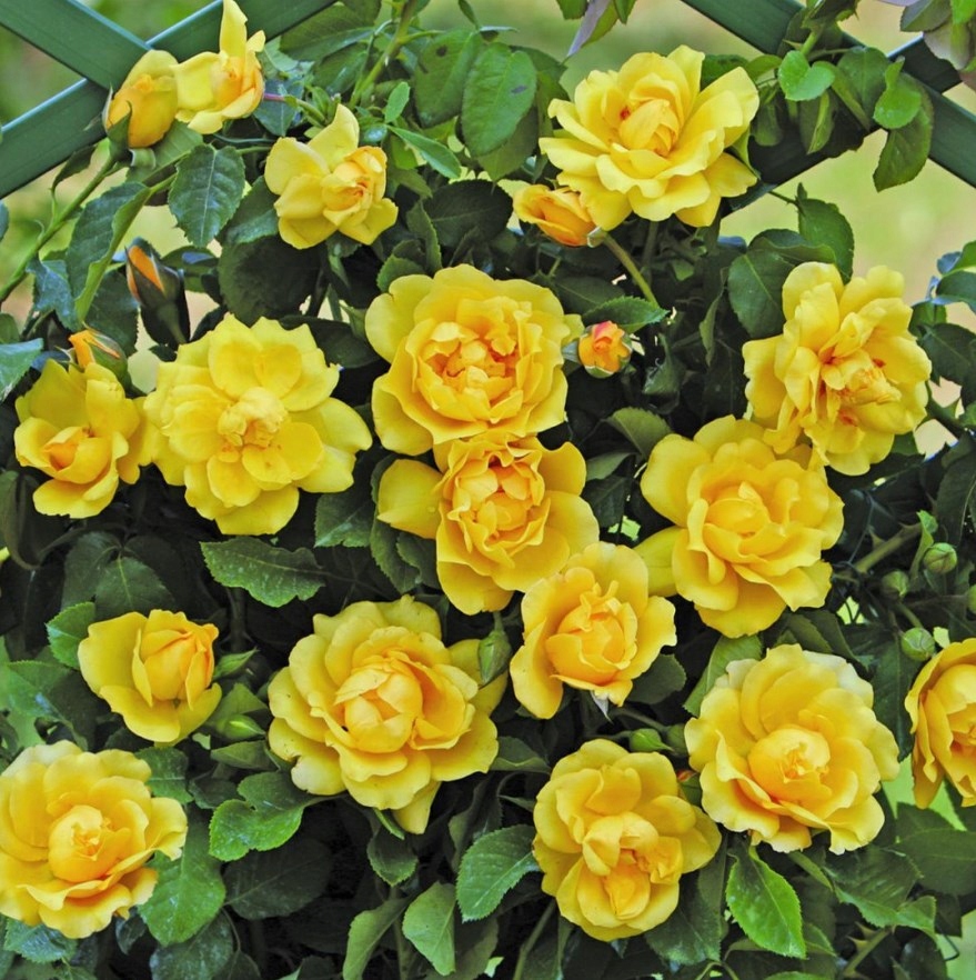 Плетистая роза GOLDEN GATE КРАСИВО ПАХНУЩИЕ ЖЕЛТЫЕ ЦВЕТЫ В ГОРОШКЕ