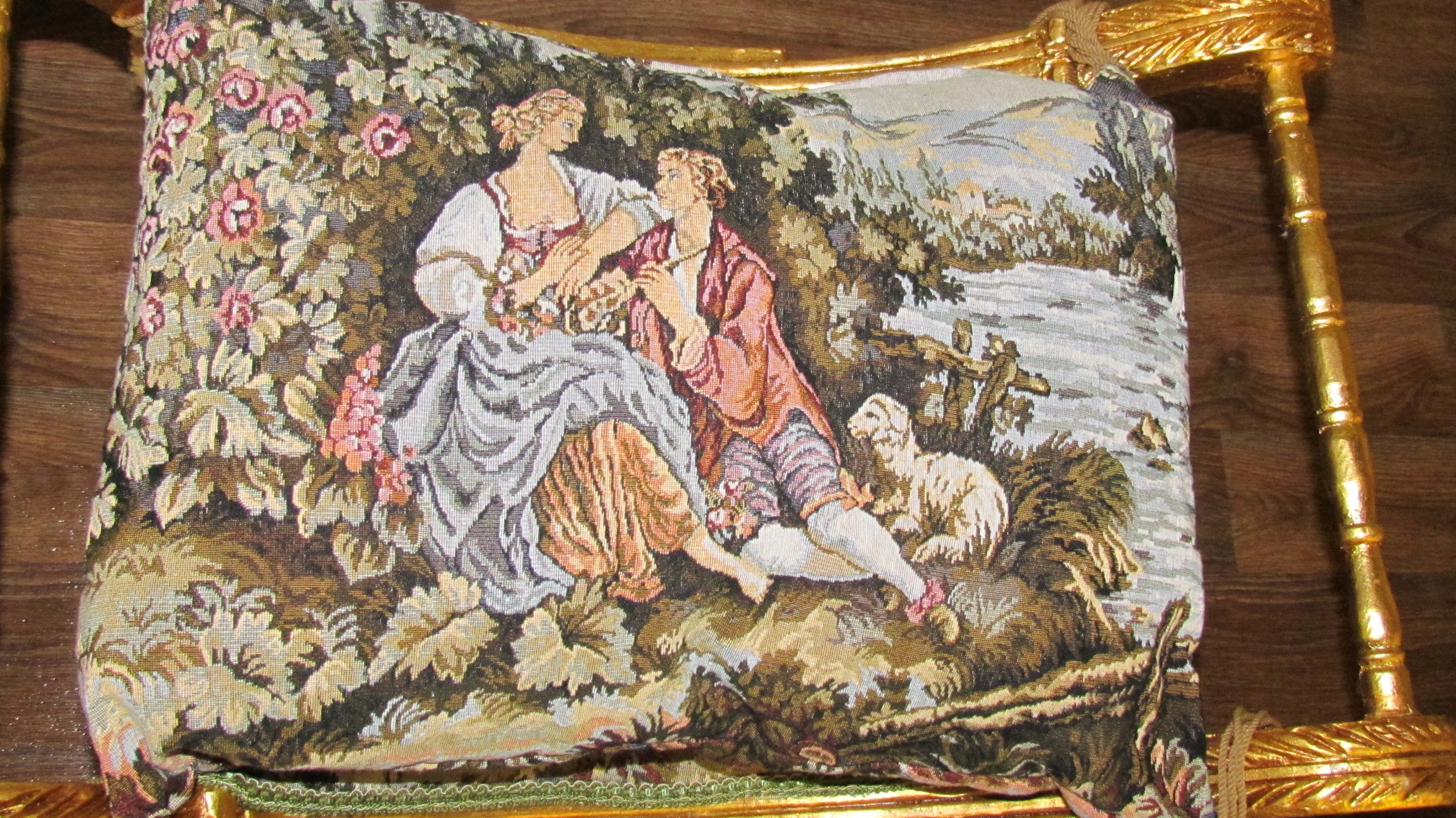 Стильный зиделек - сиденье, выполненное в современном стиле. Деревянная мебельная конструкция, тонко вырезанная по всей поверхности темно-золотым цветом. Подушка изготовлена из гобеленового материала с мотивом придворных фигур, отделана декоративной бахромой по углам. Его можно использовать в качестве сиденья в прихожей при переобувании, в ванной при пользовании туалетом или как дополнительное место в гостиной, когда приходит больше гостей.