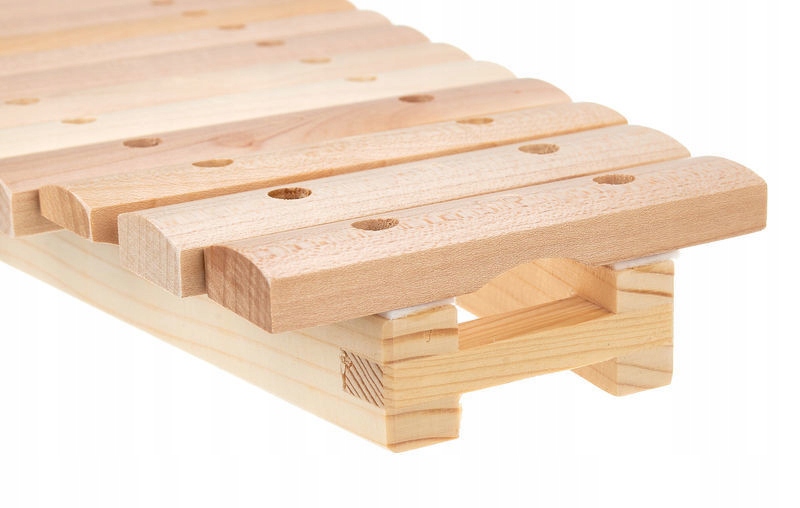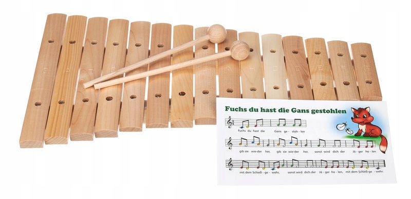 Ксилофон с 15 деревянными камнями в естественной версии и тональной линейке G2 - G4. Размеры камней 25 х 12 мм. Камни образуют кленово дерево. Рама инструмента изготовлена из ели дерева, а инструмент доставлен с двумя деревянными палочками для еды.