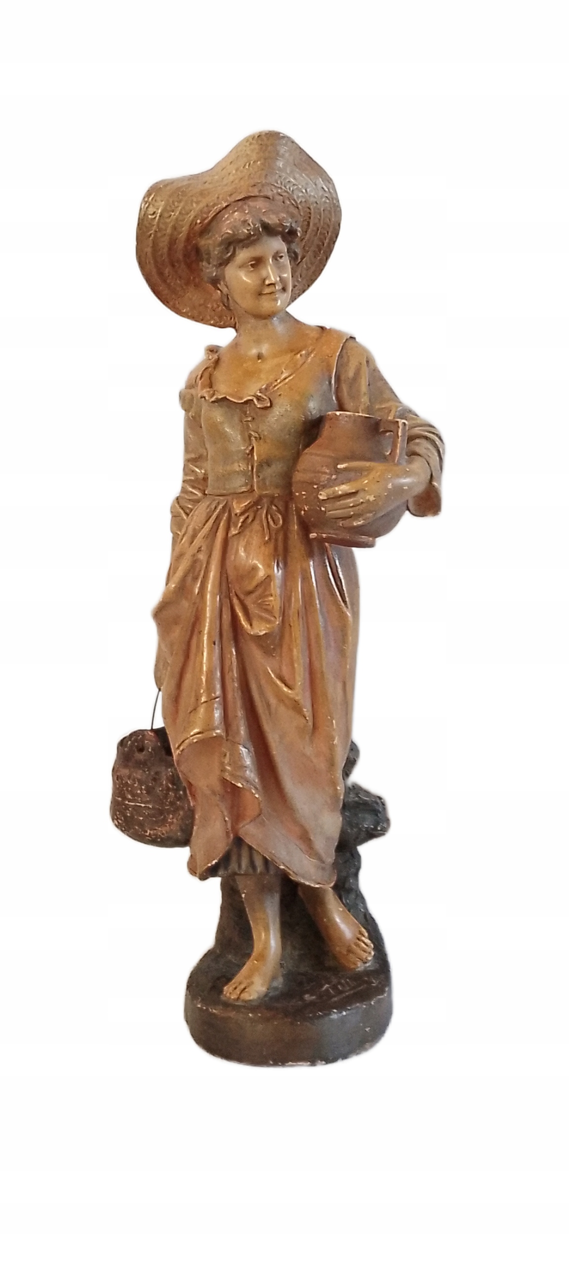 На фигуре над технологическим отверстием имеется полная каталожная нумерация и заводская маркировка, что позволяет четко датировать изделие концом XIX века. Фигура девушки излучает умиротворение и элегантность, а композиция с оленями придает произведению символический, почти аркадский характер. Высота 44,5 см делает его предметом высокой декоративности, идеальным для коллекции высококачественной европейской керамики. Несмотря на то, что прошло более 125 лет, фигура сохранила первоначальный блеск и глубину цвета. Видны лишь минимальные, естественные сколы, которые никак не влияют на эстетический вид произведения, а лишь подтверждают его возрастную подлинность. Работы Гольдшайдера этого периода регулярно выставляются в крупнейших аукционных домах мира, что представляет собой отличное вложение капитала для ценителей искусства. Это редкая возможность приобрести здание, которое является квинтэссенцией венской элегантности Прекрасной эпохи. Каждая деталь этой скульптуры, от фактуры шляпы до деталей амфоры, была проработана с особой тщательностью.